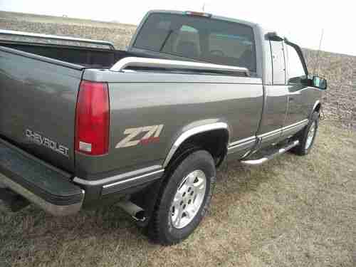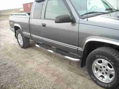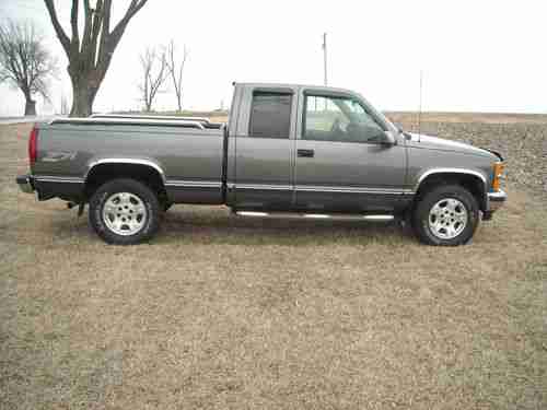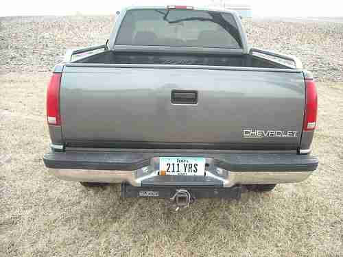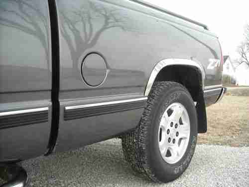 1998 CHEVROLET SILVERADO 1500 Z/71 4X4 EXTENDED CAB 3RD DOOR WITH 82,200 ACTUAL MILES. Pickup has a rebuilt title due to right rear box damage in 2001 at 32,079 miles. Pickup was repaired by a professional body shop and a complete GM replacement bed assembly was installed with no other damage. I purchased this vehicle from the estate of a very particular gentlemen who had owned this pickup since 2002 with 35,760 miles. This pickup has always been stored inside and had meticulous care. Factory Charcoal grey exterior with light grey cloth interior. Extended cab with optional 3 rd door. 350 5.7 Vortec Engine, Automatic Overdrive Transmission, part time four wheel drive and tow package. All drivetrain, frame, body and exhaust is 100% gm stock. Loaded with all Silverado options, pwr windows, locks, mirrors, seat, tilt, cruise, am/fm stereo with cassette and cd player. 60/40 bench with fold down console and overhead console. Loaded with accessories, Billet grille, Smoke Bug Visor with chrome trim, window visors, chrome nerf bars, stainless wheel well moldings, chrome bed rails, bed liner, chrome accents. 17 inch GM Avalanche wheels with brand new Iron Man 265/70/R17 tires. I wanted everything perfect on this truck and here is a list of the following parts I have replaced. New alternator, battery, serpentine belt, still have original gm one. Pitman arm and four wheel alignment. Ignition switch, brakes, left front hub assembly, GM steering sensor, power mirror switch. Just had full service performed at GM dealership, this truck needs nothing and is ready to go. Body is laser straight with no dings or dents. Absolutely no rust anywhere on pickup. Paint is almost perfect with only a couple of light scratches. Interior shows almost no wear and is close to new conditon. Please look at the pictures they speak for themselves and truck looks just as good in person. I had planned on keeping this for my personal collection, but have too many other vehicles and unfinished projects. This pickup is in truly amazing condition, looks, runs, and drives like new.
