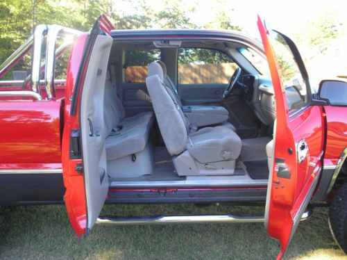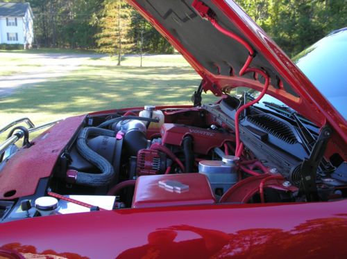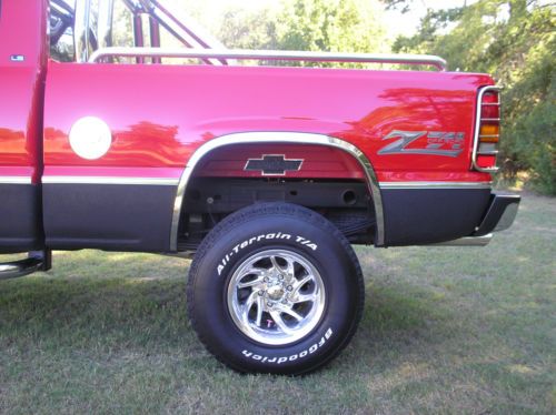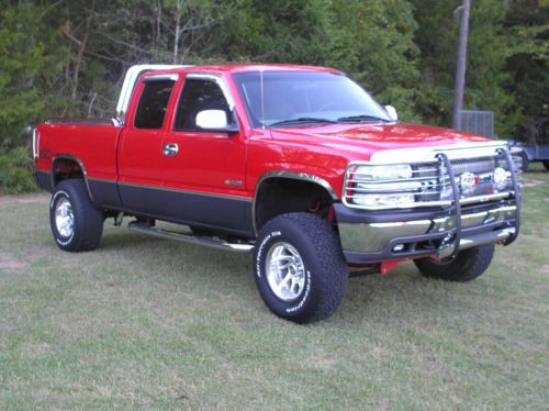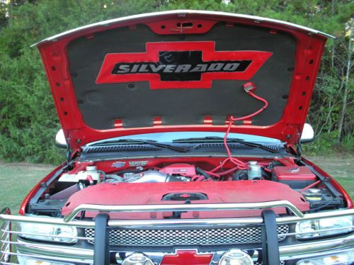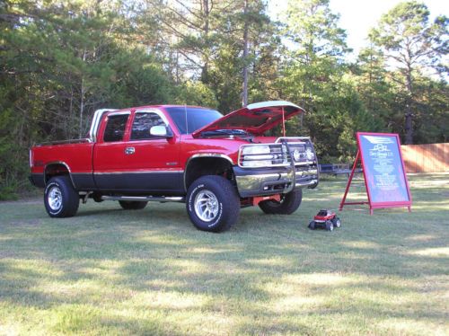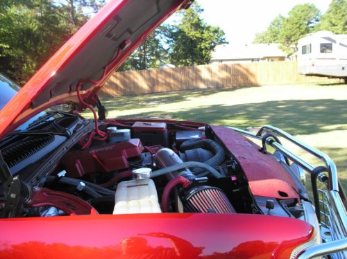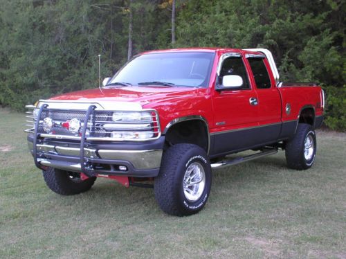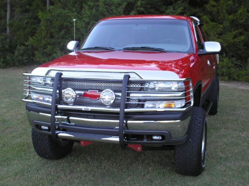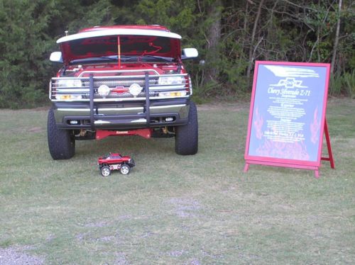 For sale is a sweet southern lifted 2000 Chevrolet Z71 4x4 with 33,000 original miles. This truck was bought new at Clarksville Arkansas and has spent it's whole life in Russellville Arkansas. I bought this truck from the original owner who made it what it is and treated it like all of his vehicles (with TLC). This truck is truly a one of a kind southern lifted multiple show winning beauty. You will not find a nicer truck, new or old anywhere. This truck has never spent a night outside or been driven in the rain. Exterior: Original like new red paint, red durabak bed liner with black bow tie graphic, rocker panels done in black durabak coating, custom chrome body trim, Rhino chrome brush guard with headlight protectors and tail light guards, Westin running boards and bed rails, Grizzly double roll bar, stainless steel bug shield, stainless steel fender trim, chrome window skirts, billet aluminum bow tie gas tank cover, 5.3L V8 with AEM cold air intake and custom/color coded engine components, red wire looms, stainless braided hoses, dual exhaust, automatic transmission, 6" rancho suspension, 295-16 LT BF Goodrich all terrain tires on 16x10 ultra wheels. Interior: Immaculate original carpet and cloth seats, polished aluminum dash accents, billet aluminum dash and door accessories, bow tie billet door sills, polished stainless and aluminum air plenum cover, custom bow tie rearview mirror, brushed aluminum steering wheel cover, custom aluminum diamond plate floor mats for show time, tinted windows, Sony CD player with bridged linear power amp and MTX 10" sub and box. Sounds great "will thump". For the show: Custom aluminum diamond plate floor mats, billet aluminum interior accents, custom Velcro bow tie for under hood, custom hood scotch, custom signage describing all modifications, matching die cast and radio controlled trucks. (Over 32 Chevy bow tie in or on this truck) Contact Mark @ 479-747-2528 if interested or have questions) Serious only bid or contact me. |