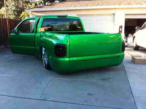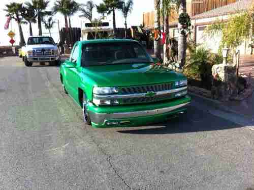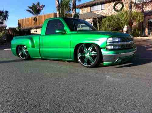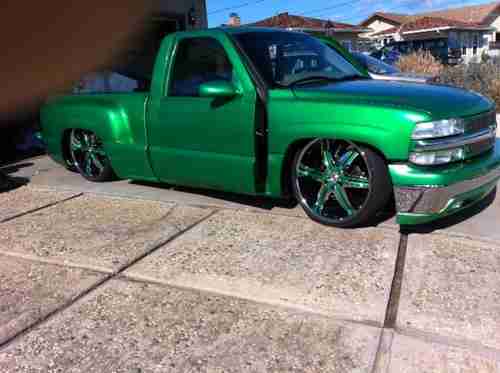 Up for sale my 2001 fully bagged stepside.Truck is all shop built Body has no dents but ,a few scratches from driving ,tailgate has a couple on top touched up but still there.Also a scratch on passenger rear fender.Truck has suiside doors all shop done and very nicely done.(they need to be adjusted)Color is beauiful and really sticks out in a crowd.24 in wheels in nice clean shape ,tires are Nexen 255x30x24 z rated like new.Body is all shaved has hard top could use a repaint.Bed is all finished looks nice and can be used for anything.Interior is real nice two bucket seats with umbar and electic seats,stereo is stock needs ground.perfect glass,electic windows,4 wheel disc brakes,Motor is 5.3 motor runs perfect no oil leaks or anything motor looks factory new.Airride has 4 link in rear all pro kit (Not made up)bought as a kit.front is bagged also but drivers bag has a slow leak not sure if its line or bag.Has two tanks and two compressiors.Truck will lay frame.Front wheel wells have not been cut out so if you want to drive it super low you need to cut them out.If your into this stuff you know it.Also the truck has a ( CLEAN TITLE)I know Im missing alot of imformation on truck so email me with questions or more pics.The only reason Im selling my truck is I want a Harley now .There is no reserve on this auction and truck is worth 10k plus. Clean title needs little work and is beauiful inside and out.Im trying to shoot a video this weekend so you can and hear it live.Im trying to disclose everthing on truck and be honest just email with questions.If your out of state I will help you with shipping .I have done this alot price for open trailer is around 700-800 dollars.in calif just pick it up.