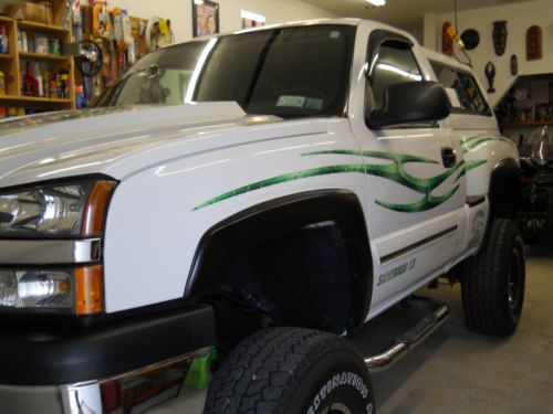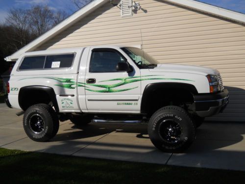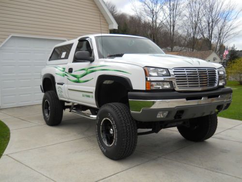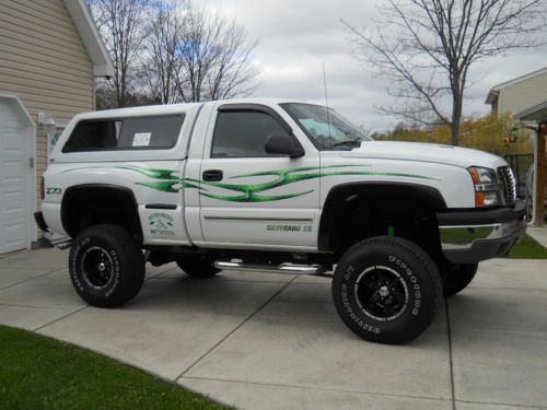 Adult Owned , This is a 2004 Silverado Z71 Shortbed , Regular Cab , Sportside / Stepside 5.3 Vortex with Automatic Transmission which was Proffessionally Rebuilt with beefier case and Corvette Servos for improved Shifting . its not a race truck by anymeans, it shifts very nice and Smooth . The engine Purrs , Always used Mobil 1 Oil since New Plus I am a firm Believer in Marvel Mystry oil , I use it in gas and oil . Truck has 79,200 Miles . I am Only Owner bought New !! It has a 6 inch Superlift Suspension with a Summit 3" Body Lift added. Brand New Firestone 35" Tires on it , Hooker Shorty Headers , The Front Drive Axels are from RCV Performance.com with 20% more travel than stock ( $ 500.00 each side ) They claim to be undestructable ?? Truck has never Off Road and been in Garage for last 4 winters . I have Winter Jeep ! There are Vinyl Grafics on truck but can be removed with no damage if new owner does not like them . I installed White Gauge Faces and Stainless Steel Bezel and Woodtrim on Dashboard and Doors. There is an All Steel 4" COWL Hood installed on truck , Custom Grill , plus iI still have Old one which I will include . There are NO ISSUES with Truck , Been very well taken care of . I have tons of slips of work done or parts replaced . IT HAS a Gibson Extreem Dual Exhaust , Sounds real Sweet and not like you just stuck a dual exhaust on . IT tows nice , small 4 wheeler trailer . I have Run nothing but Premeium Gas in truck . interior is in excellent condition , whole truck is in EXCELLENT Condition . One tiny small dent bottom of cab about the size of a Nickle . If you didn't know you would not see it .The Bed had a Rhino Bed Liner sprayed first week of owning truck , bed was not even Scratched . The ARE Cap was made for the truck ,I did not just buy Universal fit . this was made for my truck , its fully carpeted inside of cap and has lights inside and LED Brake light on roof . After 4 years of owning truck I was told that the drivers door was touched up upon delivery ?? I never new or noticed anything had been done . Quick note the what looks like SS , Emblems are Dollar Signs $$ I reminds me the Money invested in this truck . the last thing to mentioned , I do not want any one to say I was not truthful , the Frame was the last thing I was going to do , Scrap and use rust transformer stuff and Paint that color changing paint . I have painted Torsion bars and then Back surgery :( can't get under truck without hurting . see picture of undercarraige . Please feel free ask !! I just entered the correct VIN Number , My mistake it was for a Car i used to own . 11/5/2013 . I listed as 1 owner However it was in my X Wife name first than transfered over to me when Divorced . 2 owners but I drove it the whole time . I paid $32,000 for truck and over $15,000 in extras and Maintenance . Truck drives Beautiful and is a Real head Turner . The reason I'm Selling is because of Back Surgey this Summer . Hurts to get in . What I want is $ 27,000.00 Or TRADE FOR 2010- 2011 Synergy Green Camaro of Equal Value ! must Be V8 and Automatic !! NO V 6 OR 1931 5 WINDOW COUPE ? Green ? What do you Have ? Camaro is First choice but open to ?? what do you have to Offer ???? Or CASH |