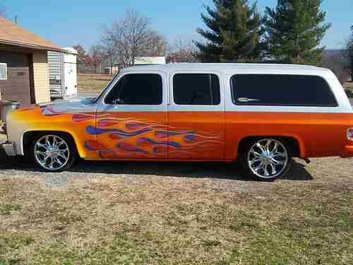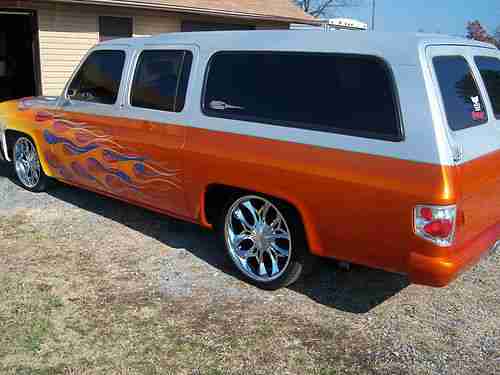 TO OLD TO PLAY CARS SO SELLING MY TOYS.....may trade...LOW RESERVE...CHECK MY OTHERS ON EBAY NEED TO SELL......THIS IS A CUSTOMISED SUBURBAN IN A-ONE + CONDITION....GREAT FOR SHOW OR DRIVE ANYWHERE......HOUSE OF COLORS PAINT AND THERE IS NO CHIPS,DINGS OR SCRATCHES ....PAINT JOB WAS 10,000.00 ALONE...WHEN YOU ARE NEAR YOU CAN SEE SMALL GHOST AND DIMONDS FADED IN THE NICE base-coat clear-cote ....NEW 22 IN. WHEELS AND TIRES....TWIN FLOW MASTERS.......SHAVED DOORS AND REMOTE OPENER WITH ALARM.......NEW LEATHER UPHOLSTERY ..AM-FM CD WITH BIG POWER BOOSTER IN REAR... ... MUCH MORE .........CAN HELP WITH DELIVERY AT A VERY LOW PRICE ..........LOW RESERVE,SO HAVE FUNDS READY IF YOU BID.........TRADE