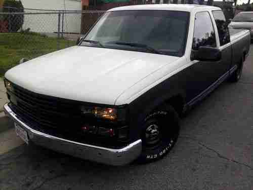 I have my 1990 Silverado extended cab in good conditions I have put a lot of work on this truck many new parts ( head lights ,tail lights, grill ,roll pan, flit kit , C notch kit on the back, lowering spindles and lowering springs ,air shocks on the back for smooth ride......the truck is lowered 5 inch in the front and 8 inch in the back.....I have rally wheels on firestone tires...it has a two tone flat black and flat white paint.......it has a minor dent on the left door bottom corner next to the tire nothing major.... the motor was rebuild year ago and is running strong no leaks anywhere.....the interior is a 7 out of 10 .....all the dash is in excellent shape the seats are old no rips just old .. it still looks good .....the truck runs excellent is a lowered truck so the ride might be a bit more rough but u will look cool.......if interested u r welcome to come drive it.....it sounds like a beast lol.....it has flow masters....