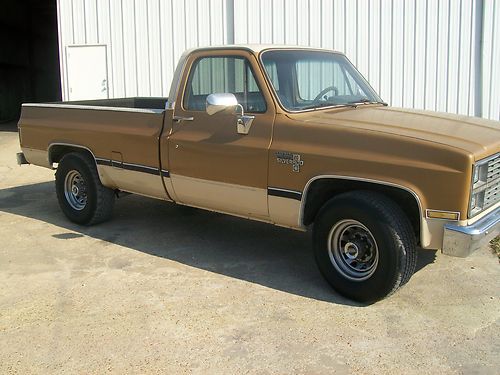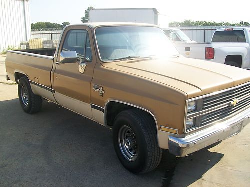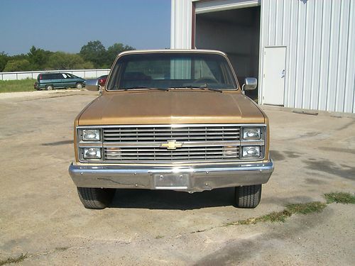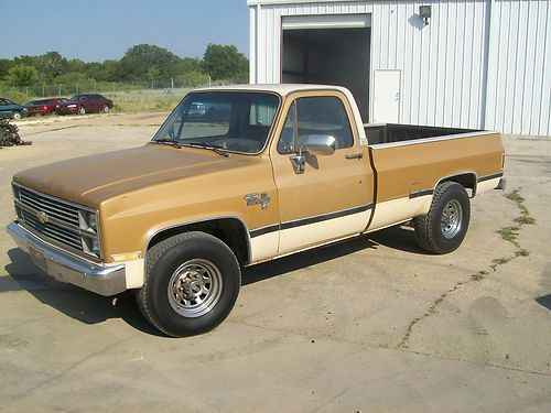1984 Chevy Silverado 3/4 ton. Ive had this truck locked up in my shop for 2 years to restore but have decided to do something different. Please look at the pictures and ask any questions you have and I will do the best I can to answer them honestly. Truck runs and drives but I have never been over 45 miles in it so I have no clue if you can drive it home 1200 miles. Please look at the pictures closely and base your decision on that. Dash has cracks, there is light hail on some panels. Power windows and door locks work. Radio doesn't. AC has been converted but needs to be charged. Air blows out the vents. Motor I would have to say sounds pretty good but will need car adjustment like they all do. Power steering looks like its been leaking and needs a bracket replaced. There are no major puddles under the truck. Like a said look it over and email me with any questions. truck is located in Stephenville, Tx I have clear blue title in my possession.