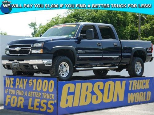 WWW.GIBSONTRUCKWORLD.COM*2006 Chevy Silverado 2500 LT Crew Cab Duramax Diesel Allison Transmission 4X4* Carfax 1 Owner with only 31k miles!!! 1 year REAL FREE BUMPER TO BUMPER WARRANTY honored anywhere in the United States with our exclusive 15 DAY RETURN/EXCHANGE POLICY! That is how confident we are in our trucks! Do not make a $3K+ mistake, B4 you buy a used truck demand to see shop bills & have the truck inspected by a 3rd party! Riding on $800 of 4 brand new Nittos, power seating, CD player, steering wheel controls, nerf bars, tilt steering, cruise control, keyless entry with alarm, towing package, bed liner, power windows, power mirrors, power door locks*Gibson is the only dealer that gives a REAL FREE 12 MONTH BUMPER TO BUMPER WARRANTY VALID ACROSS THE UNITED STATES, 12 MONTHS FREE MAINTENANCE ($1,000 VALUE!) FROM OUR 23 BAY SERVICE DEPARTMENT AND OUR EXCLUSIVE 15 DAY RETURN/EXCHANGE POLICY! It sounds too good to be true, but it is true! We will pay you $1,000 if you find a better truck for less, Gibson Truck World is Nations ahead of the competition! AT GIBSON TRUCK WORLD AN EDUCATED CONSUMER IS OUR BEST CUSTOMER**Repair Description: Total Invested = $2,715.78*10 Mile Road Test, 135 Point Inspection, Lube, Oil & Filter, Mount & Balanced 4 New Tires, LT265/75R16 Nitto, Alignment, Replaced Rear Brake Pads, Turned Rotors, Replaced Front Brake Pads, Turned Rotors, Replaced Upper Steering Shaft, Replaced Air Filter & Wiper Blades, Replaced 3rd Brake, Turn Signals, DRL Light Bulb, Replaced 3rd Brake Light, Replaced Serpentine Belt, Replaced Fuel Filter, Replaced Front Bump Stops, Replaced Window Lift Regulator, Installed Bedcaps, Replaced Mass Air Flow SensorBattery Condition Test : Good, Alternator Condition Test : Good*Labor time quoted by All Data Universal ShopKey* Gibson Truck World in Sanford, FL has the lowest price for used trucks period! Gibson specializes in pre-owned Ford trucks, Dodge trucks, Chevrolet trucks, GMC trucks, Jeeps and SUVs. Gibson Truck World sells, ships trucks across the country & worldwide. We have a large selection of F150, F250, F350, F450, F550, RAM 3500, 2500, 1500 Chevy or GM 3500, 2500, 1500 quality pre-owned pickup trucks.