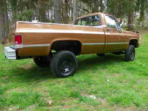 THIS IS A VERY WELL CARED FOR TRUCK THAT MY DAD ORDERED NEW IN 84, HE ONLY USED IT ON THE WEEKENDS FOR A SMALL STUMP GRINDING BUSINESS AND IT WAS KEPT IN A GARAGE ALL THE TIME, THATS WHY THE MILES ARE SO LOW. THE TRUCK IS A HEAVY DUTY SILVERADO CAMPER SPECIAL WITH A 350 THAT HAS ORIGINAL 97,000 ON IT 4 SPD MANUAL WITH A GOOD CLUTCH.THE GEAR RATIO IS 373,BED IS 8 FOOT,TRUCK HAS A/C THAT WORKS POWER WINDOWS,LOCKS THEY ALSO WORK.