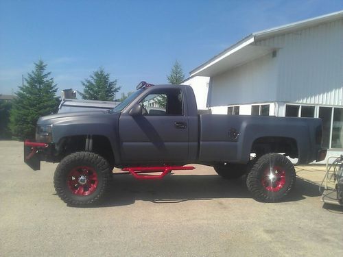 Here is a pretty cool truck we built. Its a 2001 chevy Silverado with a fiberwerx conversion, so it has the 2008 up front end, hood, and bedsides, it has a 6" fabtech lift, 38" toyo open country m/t tires on 18" kmc xd revolver rims. It has a 6.0 gas engine with an automatic transmission. Custom from bumper, custom rocksliders, custom rbp style grille, 3 really big really bright led light bars. The color on the paint is from hot rod flatz, its called machine grey, and the red is a really cool red with a very heavy metal flake in it, I love the contrast, I hope you do too. The interior is in fair condition, the seats and center console are from a 2008 Silverado, and I put in four point harnesses to go with the race theme, there is a crack in the d/s door panel. Anyway, this is a sweet pre-runner/Baja style truck that is a ton of fun to drive, and gets a ton of looks where ever I go.