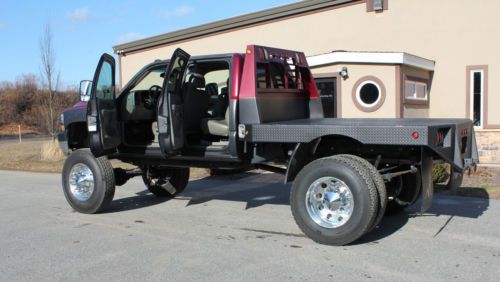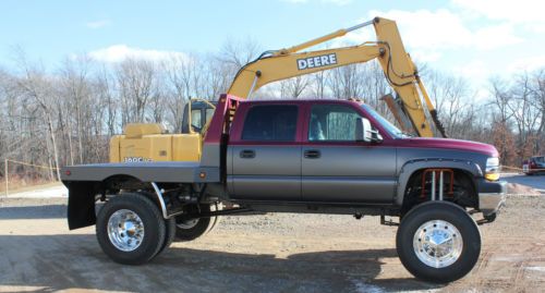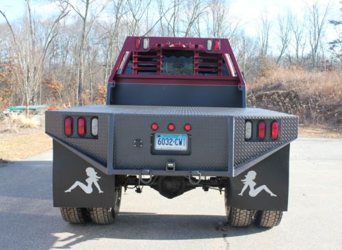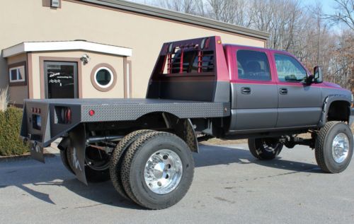 Motor: New Injectors with 50 HP nozzles, predator programmer, intake, up pipe, full magnaflow exhaust... Suspension: Ford Dana 60 up front, custom dual shock hoops in the front bolted into the existing upper control arm brackets, braided brake lines, cross drilled rotors, rear air bags, fox gas shocks all around (8 Total), approximately 12" lift... i'm sure i'm miss something Body: Brand new paint with satin clear painted pin stripe, all new cab corners and rockers, absolutely no rust or scratches $$$ Wheels: Front, 10 lug 22.5" x 9" Hub Piloted Flat Face Steer with brand new double coin tires 295/75R22.5 RLB400. Rear, 10 lug 22.5" x 8.25" Hub Piloted Accuride Wheel with brand new Double Coin tires 295/75R22.5 RLB400, Tires measure 42" high. Bed: The flat bed has been painted to match the cab, it has a hideaway 5th wheel and is wired for a trailer with trailer brake actuator in the cab. Frame. The frame has been sand blasted and painted with POR 15. This is a very unique truck that will stand out in any crowd and you will never see one alike!!! The truck has less than 500 miles on it since it was painted!! |