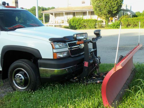 2006 Chevrolet Silverado 3500 pick up truck regular cab with 110540 miles, v8 6.6 duramax diesel engine with Allison transmission, power steering, air conditioning, single disc CD player, dual air bags, cruise control, power door locks, 4wd, ABS, tilt wheel, Am/FM stereo, steel wheels, snow plow, dual rear wheel, towing package rear deforest, 9 foot bed,
