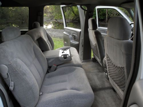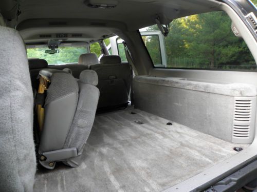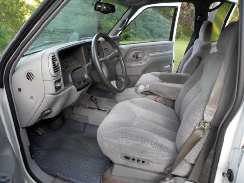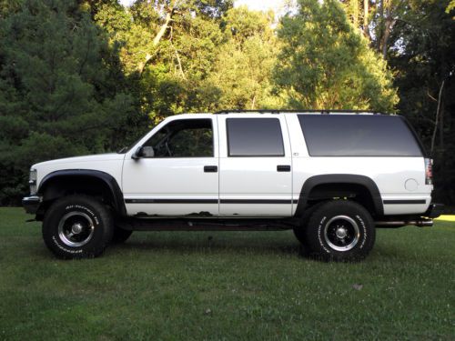 LS trim package. Cloth seats, optional front buckets with power drivers seat and center console, optional 3rd row seats. Power locks, windows and mirrors, remote keyless entry, cruise control, tilt steering wheel, stereo with CD player, optional rear heat and A/C, overhead console, auto-dimming rearview mirror with temp and compass. Cup holders and storage everywhere. Rear barn doors. Skid plate package (front differential, transfer case and fuel tank). Roof rack, trailer hitch/towing package, tinted rear windows. Pretty much loaded with almost every available option in 1998 except leather, heated and power passenger seats. Longer than a Tahoe or GMC Yukon . Same cargo space as a fullsize longbed C/K pickup truck... easily fits 4x8 sheets of drywall/plywood and lumber in the back, with the 2nd row seats folded down flat and 3rd row seats removed. Never smoked in, no pets. Purchased in 2005, and have put about 55,000 miles on it since then. Over $8,000 worth the parts serviced, replaced and upgraded during ownership, including... Fuel System: New GM Delphi fuel pump, GM AC-Delco fuel pressure regulator and fuel filter. New take-out GM crate engine LS1 Corvette fuel injectors. Engine: New Fel-Pro top-end gaskets, including head, intake manifold, intake plenum, exhaust manifold and valve cover gaskets. New Comp Cams hydraulic roller lifters, Melling push rods, Sealed Power valve springs and locks, Fel-Pro valve stem seals, Sealed Power rocker arms and pivot balls. New ARP head bolts. Ignition and Electrical: Newer Accel distributor cap, rotor, 8mm spark plug wires and U-Groove spark plugs. Newer Accel 48,000V ignition coil. PowerMaster 200 amp alternator. Optima Red Top AGM battery. Newer front headlamp housings. Clear front corner markers. Newer headlight, taillight and front and rear turn signal bulbs. Painless Wiring high beam 4-headlight relay kit (so low beams stay on when high beams are turned on!) Newer trailer light wiring harness. Exhaust: New Edelbrock titanium-ceramic coated stainless steel headers and downpipes. Stillen Pro-X 2-1/2" dual rear exit cat-back exhaust system. New upstream (pre -cat) O2 oxygen sensors. Other Engine: Newer K&N air intake kit, Newer BBK 80mm Power-Plus throttle body. New idle air control IAC valve and PCV valve. New serpentine belt. New belt tensioner and idler pulleys. Engine computer custom tuned with HP Tuners VCM Suite (currently setup for 93 octane fuel.) Mobil 1 full synthetic motor oil and K&N oil filter changed every 3,000 miles. Heating and Cooling Systems: New GM AC-Delco upper and lower radiator hoses and water pump bypass hose. New 180° thermostat. Cooling system flushed and filled with fresh Prestone Dexcool (orange) antifreeze. New A/C accumulator/dryer canister, a couple new A/C lines and several new seals. Brake System: Remanufactured front brake calipers. New Duralast Severe Duty front brake pads. Newer front and rear Russell brake speed bleeders. A couple new brake hard lines. System flushed and filled with fresh Prestone DOT3 brake fluid. Suspension: Bilstein Sport series (firm valving) monotube front and rear shock absorbers. Front upper ball joints, sway bar endlinks and bushings. Steering System: Rebuilt steering system, using only new GM AC-Delco, Dana Spicer and Moog chassis parts, including all inner and outer tie rods, tie rod adjusting sleeves, pitman arm, idler arm and pivot support bearings. Newer KYB steering stabilizer shock. Transmission: Newer transmission filter and pan gasket. Energy Suspension polyurethane transmission mount. Transmission filled with Mobil 1 ATF. Drivetrain: Used take-out 1-ton (K3500) Borg-Warner 4401 transfer case with fixed output yoke (replaced weaker 1/2 & 3/4-ton NP241 slip yoke x-fer case). Transfer case filled with Mobil 1 fluid. Denny's Driveshaft 3" steel slip-spline rear driveshaft (lifetime guarantee against twisting or breakage), with Spicer U-joints. Newer Timken rear axle carrier and pinion pilot bearings. Locking differential carrier replaced with used take-out Eaton Gov-Lock (posi). Billet aluminum 2" thick rear wheel spacers (the factory front track width on these 3/4 and 1-ton trucks is 4" wider than the rear!) Rear axle filled with Mobil 1 gear oil. Wheels and Tires: 315/75R16 (35x12.50) BF Goodrich Radial All-Terrain T/A KO tires on 16x10 Ion Alloy aluminum wheels with McGard locking lug nuts. Performance Accessories 3" body lift kit and Bushwacker Cut-Out front fender flares. Newer winter wiper blades. Husky Liners front floor mats. Truck comes with a nice set of replacement passenger side doors and a nice set of front fenders (complete with inner fenderwells and stock flares), if you prefer swap out the modified fenders and cut-out flares. All are in good condition, off of other 1998-2000 Summit White trucks, so no painting is needed. Truck also comes with a new Flowmaster Force II 3" cat-back exhaust system. Truck also comes with a new drivers side interior door handle assembly, 2 new power mirrors and a new power mirror switch assembly. Needs: Once warmed-up, truck is blowing white smoke out of the exhaust and misfiring, and the computer is throwing a misfire code and check engine light for it. Smells like anti-freeze. I suspect a cracked intake manifold, head or block? There appears to be no excessive exhaust gas pressure or oil in the coolant, and no coolant in the oil. The top end of the motor had just been redone, including all new gaskets, but coolant is still leaking into the exhaust somewhere. Passenger side doors are dented (wife backed into it, in the driveway!) (replacement doors included.) The A/C system needs evacuated and recharged, now that the leaking lines and accumulator have been replaced. Front windshield has a crack on the passenger side, by the A-pillar. The door locks are frozen if you try to use the key, but they lock and unlock fine, from the power buttons inside or with the keyfob remote. The drivers side interior door handle broke (common issue with