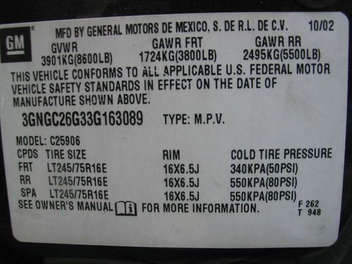 2003 CHEVROLET SUBURBAN 2500 LT AUTORIDE, 1-OWNER, 142,280 MILES, GARAGE KEPT, NON-SMOKER, FLORIDA VEHICLE, NO ACCIDENTS, WELL MAINTAINED, 8.1 LITRE VORTEC ENGINE, AUTOMATIC TRANSMISSION, 2-WHEEL DRIVE, AUTORIDE SUSPENSION, 4-WHEEL ABS, REAR AIR CONDITIONING, POWER WINDOWS, LOCKS & CRUISE CONTROL, LEATHER INTERIOR IN GREAT SHAPE, DUAL POWER HEATED SEATS, THIRD ROW SEAT, PREMIUM BOSE STEREO, PANASONIC DVD ENTERTAINMENT SYSTEM, DUAL AIRBAGS, KEYLESS ENTRY, ONSTAR, RUNNING BOARDS, ROOF RACK, TOWING PACKAGE WITH ELECTRIC BRAKES, FACTORY ALLOY WHEELS, BRAND NEW MICHELIN TIRES, DRIVES PERFECT DOWN THE ROAD , HAS NO ISSUES. ANY QUESTIONS PLEASE CALL 813-610-9800.
