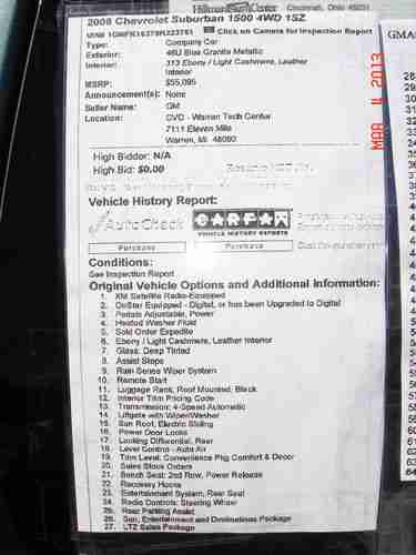 Vehicle is former GM Company Car purchased via dealer on August 6, 2008 at milage 7340. Service records available thereafter.Original battery replaced 5-16-11 at milage 37,605.Tires are Michelin P275/55R20---111T---LTX---M/S2. Installed 3-19-12 at milage 50,548. Window tint done by AutoStyles. Darkest legal under Florida law.Last maintenance 1-10-13 at milage 61,040. Oil change, tire rotation, wiper blade replacement.Current (3-5-13) milage is 62,892.Original Vehicle Options and Additional Information pictured in last two photos.