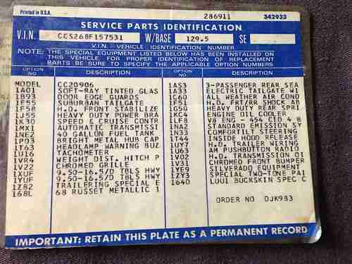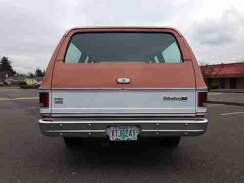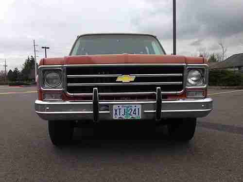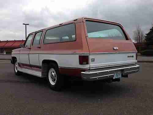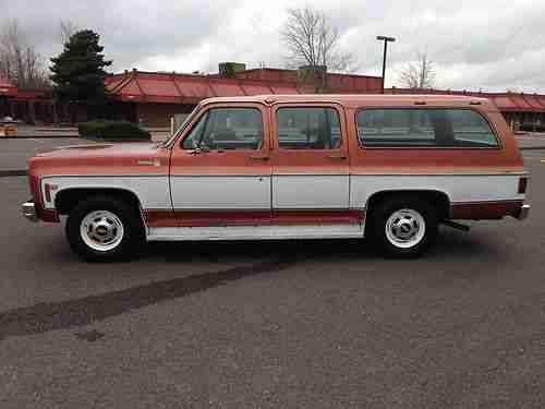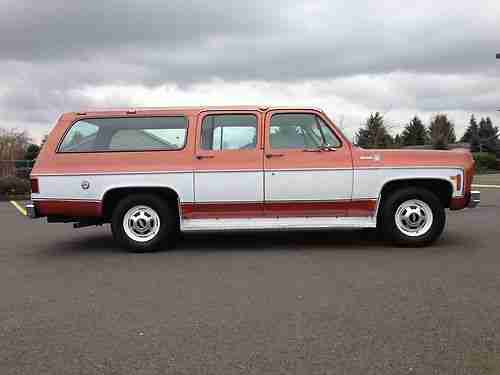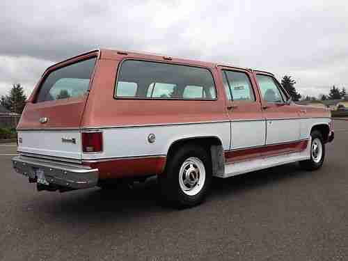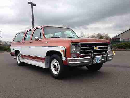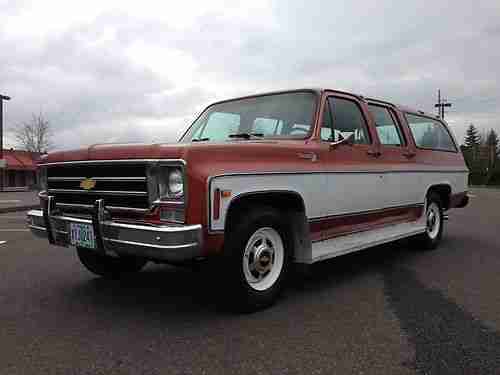 1978 Chevrolet Suburban Silverado Trailering Special. This Suburban was special ordered as a two wheel drive 3/4 ton with the rare trailering special option which included, one ton suspension, 4.10 gears, heavy duty springs, shocks, front and rear sway bars, bigger front disc and rear drum brakes, heavy duty tow hitch, trailer brake module and wiring harness. This truck with this option was installed with the LF8 454 which had different heads and cam for more torque and did not have all the smog equipment. The motor was rebuilt 40K ago. It has a MX1 Turbo 400 transmission that has been upgraded with a shift kit for firmer shifts. It also has from the factory a heavy duty transmission cooler and engine oil cooler. This makes it rated at 11,000 GCW (gross combined weight). It is also equipped with dual exhaust as well which is new. The options are as follows, power steering, power brakes, HEI ignition, deluxe air conditioning which blows ice cold, electric tailgate window, soft-ray glass which is all perfect, tilt steering, cruise control, headlamp warning buzzer, tachometer, deluxe cloth interior, am/fm stereo, door edge guards, 40 gallon fuel tank, chrome grill, chrome front bumper guards, Silverado option, drip moldings and two tone paint. This Suburban has 164K on the odometer and runs great, starts up on cold mornings with the choke on and comes to idle when it warms up. Factory wheels, deluxe caps and new tires with warranty. The headliner and front carpet are all new and the rest of the interior looks amazing! On the drivers seat upright, the fabric is starting to split, this fabric is still available. Now for the outside, this Suburban is real straight for its age, most of the paint is original and very presentable, the hood is thin but glossy like no tomorrow, even the door jams are perfect. There is a little rust under the driver door rocker panel but it is very minor. The right rear lower quarter panel has a small amount of bubbling as well, but again, very minor. The chrome is amazing throughout and the rear bumper is new. This truck comes with all of the history, window sticker, build sheet, service parts identification decal, owners manual, maintenance schedule and all service and repair records. This truck is an excellent candidate for a tow vehicle for your race car, horses, travel trailer, utility trailer, or whatever you desire and in all confidence!! Special ordered and purchased new from Murray Chevrolet in Gresham, Or. I purchased this truck from the original family 10 years ago. Every time I take it out, it draws a crowd of people who can't believe the condition. It has been stored in doors it's whole life and it shows. If your in the market for an early Suburban that tows, thats in amazing condition, look no further, this is a find.