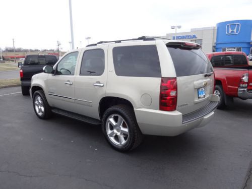 Set your sights on this gold 2009 Chevrolet Tahoe LTZ. It comes with a 5.30 liter 8 CYL. engine. We're offering a great deal on this one at $25,977. Compare that to the $26,410 offered elsewhere. Don't skimp on safety. Rest easy with a 4 out of 5 star crash test rating. You can have it hot while the passenger has it cold thanks to dual zone climate control. Check out the light cashmere/dark cashmere leather interior. Keep the kids entertained on long drives with the DVD system. Park with ease using the parking sensors. This vehicle comes with a sunroof. According to a review from New Car Test Drive, Automotive engineers judge wind-cheating aerodynamics by a factor known as the coefficient of drag: The lower the number, the easier air flows over it. Call today to take this one out for a spin! FOR EVEN LOWER PRICE E-MAIL DEALER AND GET AN INSTANT RESPONSE & LINK TO MORE PHOTOS & DETAILS. ASK FOR THE SALES DEPARTMENT!