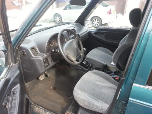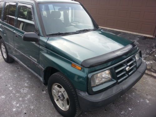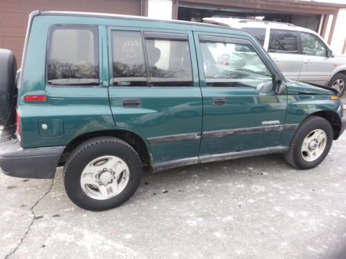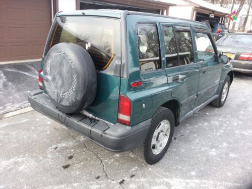 Green 1998 Geo Tracker 4 door hard top, Automatic, 4-wheel drive, 4 cylinder 1.6L engine with 136,636 miles. Aluminum wheels. Tires 235/R15 have only about 40% life left. Runs good. Great gas mileage of 28-34 mpg, but some actual holes/tears. please check all the pictures before biting as I'm selling this car as is.