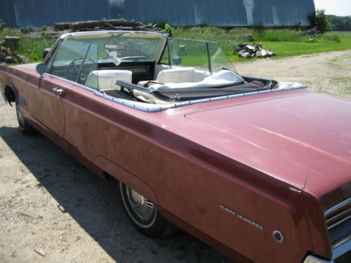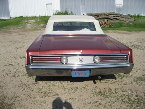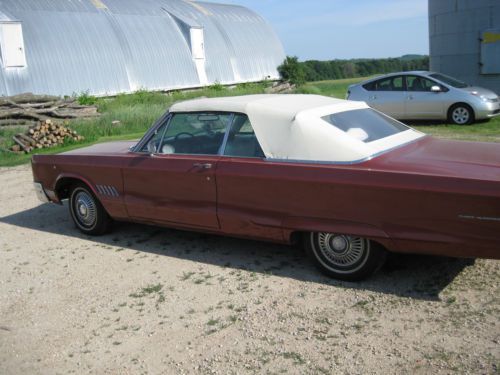 1968 Chrysler 300 Convertible in drivable condition. Has Kelly Steel Belted P215/75R15 tires which cause the speedometer to read about 8 MPH on high side. Driver's side power seat working. No major rust issues anywhere on vehicle. Headlight hideaway motor recently replaced & all lights work except back-up lights & right front marker light. New Champion extra core radiator. Glass is all in good condition. Recent new top has glass rear window. New boot cover but it's a tight fit. Drives very well at highway speeds.