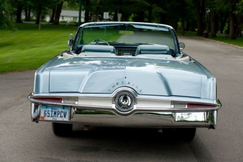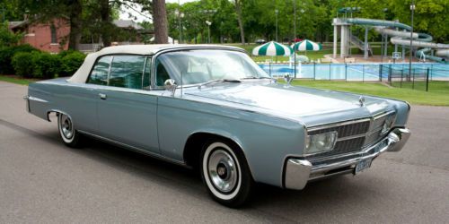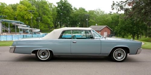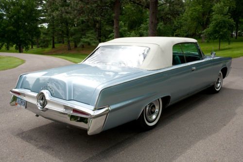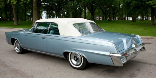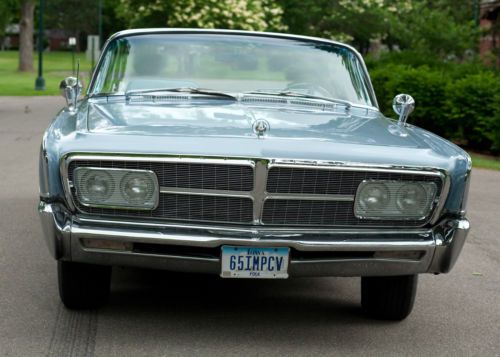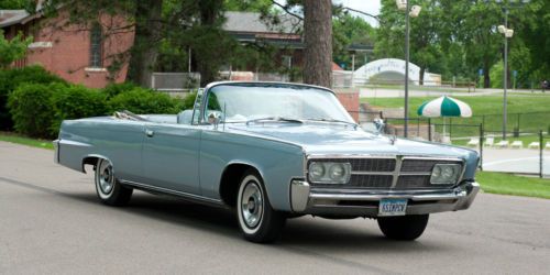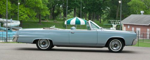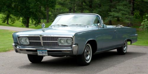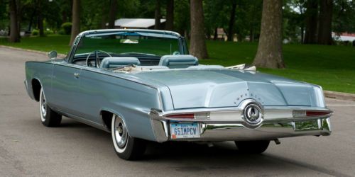 1965 Imperial Crown Convertible in excellent running and driving condition, rebuilt 440 engine and torqueflite transmission, nice paint and power top, factory air conditioning converted to R134A, power windows (including power vent windows), very comfortable power seats with new, exact reproduction leather upholstery, factory AM/FM signal-seeking radio with working power antenna, "Auto Pilot" cruise control (not working), remote mirror control, remote trunk release, both soft and "parade" top boots, rebuilt suspension. All lights, signal, gages, speedometer, odometer/trip odometer work properly. It's a real joy to drive, as it has plenty of power, shifts smoothly, steers easily and straight down the road, with no squeaks, rattles or groans. It's a rare classic car that you can still drive confidently and comfortably in freeway traffic.