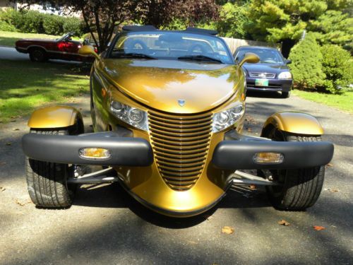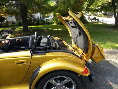 THE 2002 WAS THE LAST PRODUCTION YEAR FOR THE CHRYSLER PROWLER. THIS INCA GOLD METALLIC WAS ONLY ONE OF 616 PRODUCED. IT HAS A MOPAR TRAILER HITCH INSTALLED AND MOPAR MUD FLAPS. THE PROWLER HAS A BLACK SOFT-TOP CONVERTIBLE ROOF AND IS EQUIPPED WITH CHROME WHEELS AND 4 WHEEL INDEPENDENT SUSPENSION. THIS CAR IS LOADED WITH EXTRAS; STAINLESS STEEL MUFFLERS, WIND-SCREEN, CHROME GEAR SHIFTER, EXTRA TAIL LIGHTS, PLUS AN EXTRA TRUNK. THE STANDARD FEATURES ARE AIR CONDITIONING, CRUISE, POWER LOCK, POWER WINDOWS, POWER MIRRORS, AM/FM/CASSETTE/CD, WITH LEATHER SEATS.