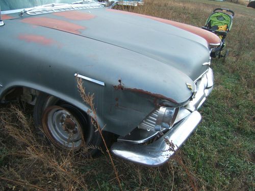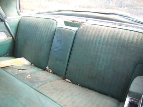 This is a 1957 Chrysler Imperial 4 door 4600. It is not a running vehicle, and I have no idea what it needs to get running. I bought it from an elderly lady at an estate sale with the dream of restoring it. It was her husbands, and she knew nothing about it. I never tried getting it running. For sitting outside for years, it is in fairly good shape I think. It is missing part of its front bumber as you can see in the picture. It is rusting in places, but looks as though it is only surface/paint rusting. There are a few dents, and broken lights, etc. You can see most of the defects in the pictures. The windshield is the only window that is broken. The doors do not open from the outside, and only three open when opened from the inside. The right passenger back door handle is broken in the inside. The radio is missing. It is a push button transmission. Mice have invaded it, and have chewed a lot of the fabric. The right back passenger window is rolled half way down. The trunk is filled with headlights, wiring, and other parts that I am not sure what they are or what they go to. The body seems really sound with no major rusting underneath it that I know of. I did notice when I rolled it home was that the back drivers side tire was really wobbleing like it was about to fall off. That is about all I can tell you about it. I no nothing about mechanics, and have no idea what might be wrong with it. The mileage has two numbers, I don't know which you go by or if you go by both, but it is 9999 55167. Buyer is responsible for all shipping costs and arranging the transport.