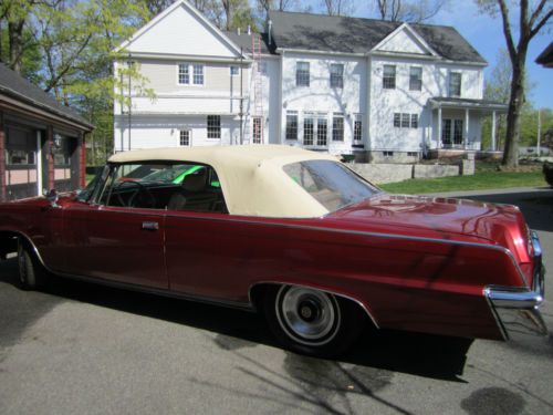 Very beautiful 1965 Chrysler Imperial Crown Convertible. Drives and runs great, looks great as well. Custom paint done about 12 years ago, a stunning deep maroon with a clear coat finish. A nice tan convertible top and matching interior. All was redone about 12 years ago by the previous owner. I have had the engine rebuilt, and the transmission serviced and the whole car overall gone over. It really is a great car and I do not have issues driving it anywhere. It is not a perfect car however. There are some issues, there is one chip of paint missing from the hood. The only other issues that I am aware of have to do with the dashboard. The gear shift indicator and speedometer do not work. The speedometer needs to have the grease removed from the maqnet is what I am told. The gear shift indicator seems a bit more complicated. Other than that, the heat and ac have been disconnected and I have never had that addressed. The fan however does work. Also the antenna needs to be replaced and a window button does as well. This car is definitely a head turner. It has been used in a number of parades and weddings. It spends most of its time in a garage and is not used much more at all. The interior and the carpets are in excellent condition, as is the top and the rear window. The top goes up and down very nicely. The whiskers in the passenger windows needs to be replaced as well. The ride is very smooth and luxurious. The car is also very peppy and fast. It is a very heavy vehicle and handles itself very well. |