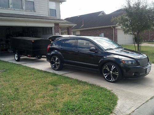 This is a black Dodge Caliber that has been lowered with 20" wheels on it. It also has halo headlight with a billet grill on it. The back lights are also blacked out. This car has a very nice look to it.