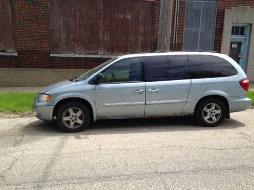 2003 Light Blue Dodge Grand Caravan, with dark blue leather interior:  It seats 7 comfortably, with room for luggage.  The inside is beautiful with the leather seats. There are no tears, holes, etc. anywhere in the interior. It does have some rust. It is considered GOOD condition. In the rear corners of the bumper, there are a couple of good dings where I backed it into a concrete wall a couple of times, but it doesn't take away from the overall appearance of this well maintained van. There are many miles on it, but it has been well worth the up-keep as it just keeps delivering.  |