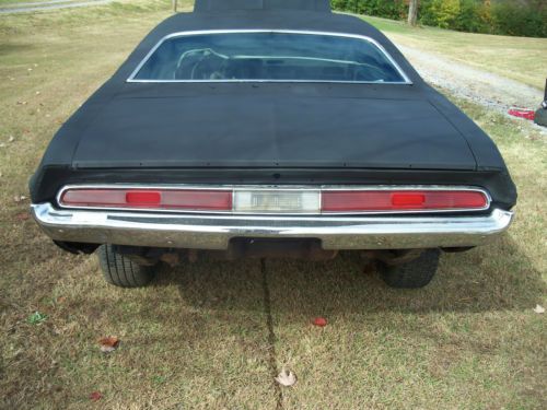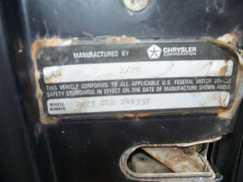 THIS CHALLENGER IS A FACTORY SUNROOF VEHICLE AS FAR AS I CAN TELL. I'LL TRY MY BEST TO EXPLAIN. THERE IS NO BUILD SHEET FOR POSITIVE PROOF. LOOK AT THIS POST AND DECIDE FOR YOUR SELF. EBAY WILL NOT ALLOW THE POST!!! LOOKING FOR A WAY TO GET IT OUT TO YOU. THE MAGNUM 500 WHEELS ARE NOT INCLUDED.WILL INSTALL DIFFERENT WHEELS AND TIRES THE FENDER TAG READS OF FOLLOWS : P31 R22 V5X Y05 26 EN1 M25 M31 M91 N85 N88 C55 C62 G33 H51 L31 M21 V1X A01 A62 A63 B51 C16 TX9 H5X9 000 122 K00188 E44 D31 JH23 GOB 241357 THE REASON I BELIEVE THIS TO BE TRUE IS THE FENDER TAG GIVES A BUILD DATE OF 1 / 22 / 1970 AND THE DOOR TAG GIVES THE DATE OF 2 / 1970. ALSO THE ORDER NUMBER K00188 .THE K WOULD INDICATE THE CAR LEFT THE FACTORY FOR ASC FOR THE SUNROOF INSTALLATION.PER THE POST. IF YOU CAN'T FIND THE POST EMAIL ME AND I WII TRY TO SEND THE POST TO YOU. NOW FOR THE CAR IT IS TYPICAL E-BODY THAT SOME ONE LEFT OUTSIDE TO WEATHER. NEEDS FLOOR PANS TRUNK PANS LOWER QUARTER PANEL REPLACED.THERE IS SOME FILLER IN THE UPPER QUARTER ON THE DRIVER SIDE.THIS CAR IS VERY RESTORABLE AND EXTREMELY RARE. THE FRONT FRAME RAILS ARE IN GOOD SHAPE THE REAR RAILS NEED A PATCH INSTALLED. I HAVE A DONNER CAR THAT I WILL REMOVE THEM FROM NO NEED TO REPLACE THEM AS A HOLE.THE HOOD AND FENDERS ARE GOOD WITH SOME PITTING BUT USABLE.THE FRONT WINDSHIELD POST WILL NEED TO BE REPAIRED OR REPLACED.I KNOW YOU WILL WANT MORE PICTURES BUT EBAY ONLY WILL ALLOW 24. ASK I WILL SEND THEM TO YOU. THE POWER WINDOWS ARE IN THE CAR AND STILL RUN THE POWER ROOF MOTOR RUNS BUT I GOT IN A RUSH AND STRIPED A GEAR IN THE MOTOR.THE FUEL TANK IS BAD AND RUSTED THROUGH.THE DRAIN ON THE FIRE WALL AT THE WINDSHIELD WIPER IS ALSO RUSTED.THE CENTER CROSS MEMBER HAS HAD A SECTION REPLACED SOMEONE CUT THROUGH IT WITH A TORCH.TRANSMISSION MOUNT IS INSTALLED.ALL DOOR AND REAR INTERIOR PANELS ARE IN THE CAR AND LOOK VERY GOOD ALL WINDOW SWITCHES ARE IN THE PANELS AS WELL AS THE WIRING. YOU MAY COME LOOK IF YOU LIKE.THE CAR IS IN EAST TENNESSEE I WILL EMAIL YOU MY ADDRESS FOR YOUR INSPECTION.THE FRONT PARKING LIGHT LENSES ARE NEW YEAR ONE REPLACEMENTS. HERE IS A LIST OF OTHER PARTS THAT COME WITH THE CAR. 318 ENGINE 904 TRANSMISSION ENGINE STUCK, AC COMPRESSOR CRUISE CONTROL PARTS, FLOOR SHIFT ROD, WOOD GRAIN FOR THE DOORS, CENTER CONSOLE NOT COMPLETE, NOS FELT SEAL FOR THE SUNROOF I ALSO HAVE THE INSIDE COVER FOR THE ROOF.FRONT SWAY BAR. I WILL POST MORE PARTS AS I FIND THEM.IF YOU WOULD LIKE TO TALK TO ME ABOUT THE CAR SEND ME YOUR TELEPHONE NUMBER AND A TIME TO CALL.I HAVE A TITLE PRINTED FROM 1976 BUT NOT IN MY NAME.I HAVE APPLIED FOR A TITLE BUT HAVE NOT RECEIVED IT. I WILL SUPPLY A CLEAR TITLE. On Nov-07-13 at 19:58:29 PST, seller added the following information: 1970 DODGE CHALLENGER This Challenger is a FACTORY SUNROOF Vehicle as far as I can