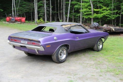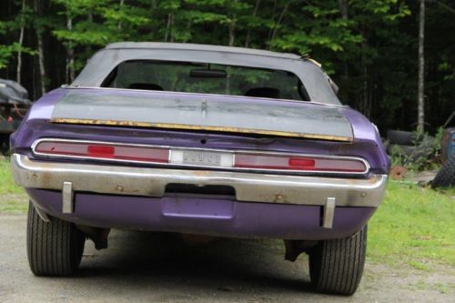 This is a 1970 Challenger Convertible that is a factory 6 cylinder car with a 3 speed manual trans. They only made "91" 6 cylinder 3 speed manual challenger ragtops in 1970. The original /6 is long gone. The original 3 speed manual trans is still in the car with all linkage hooked up. The car has an 8 3/4 in it now. No idea what is has for gear ratio as we have not checked. The challenger comes with a 1972 340 engine. The prior owner stated it is a forged crank 340. Engine needs a complete rebuild and I have no history on the motor except that is came out of a Challenger. This convertible is a project car. A project car that is located in the Northest and has probably spent a considerable amount of time here. It has most of the convertible specific parts and they are in pretty nice shape with exception of the sunvisors. The rear view mirror bezel is missing. The car is a power top car and the convertible motor is still in place. The lines are however cracked and therefore the top now goes up and down by hand. The convertible frame appears to be in very nice condition. The convertible windshield trim inner and outer is very nice. The rear convertible trim is there as well and only needs a couple dings banged out and repolished. The convertible rear door panels have speaker holes in each one. One is brown and has been dyed, the other is an original black one. The rear convertible seat has a solid frame and also has the boot channel intact. The car comes with a new convertible white top with glass back window. The seat cores are in good condition. Front door panels are very nice. The side glass is in pretty good shape with minimal scratches. It has all the convertible specific glass. The front windshield is there but will probably need a new one. The body needs considerable work. The rear of the car was hit as some point and the tailight panel is tweaked as you can see in the pics. At the the time of the accident it must have went off the road as the rear frame rails are bent towards the end of the car. The car needs a whole new trunk floor and extensions so ideally the car should have the one piece trunk floor and frame rails assembly offered from Dynacorn installed as you will cure the frame rail issues and sheet metal at the same time. It is only $1300 for this piece and will cure the two aforementioned issues. The floorpans needs replacing as well. The cowl has a portion replaced around the booster area that was cut out of another challenger but was not welded in yet. The front frame assembly is very straight and solid. The inners fenders have been worked at some point and show signs of excessive bodywork. They should be replaced. The fenders, doors and quarters have all been patched and are in rough condition. The challenger hood looks ok and the trunk lid is useable as well. The car is a major project however is a good starting point and has 99% of the hard to find convertible parts included. The car come with a radiator core. The heater box is also in very good condition. There are some extra parts that will be included in the trunk consisting of vents, original weatherstripping front valence, etc. The 340 engine will be installed in the engine bay for transport only. It will not be running. The car has the original fender tag, and all body numbers match the VIN. There is no broadcast sheet. I am listing this car for my brother as he has decided to focus on a different car he is restoring. THE WHEELS AND TIRES ON THE CHALLENGER ARE NOT INCLUDED. THEY GO ON MY CAR AND ARE ONLY USED FOR ROLLERS CURRENTLY. The car will have four rollers that hold air installed on the car upon shipping. There is NO title for this car. Titles are not needed in Maine and this car has been in storage for 20 years. The owner will be provided a valid maine registration and bill of sale. This will typically be enough to register a car in your state. Do your due dilligence prior to bidding. Please come and inspect the car if you are concerned with its condition. It is a major project but a worthy restoration candidate. There is no brakes and does not run consider that when setting up a shipping company.