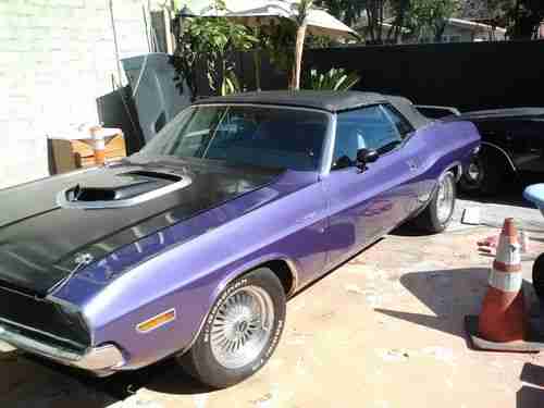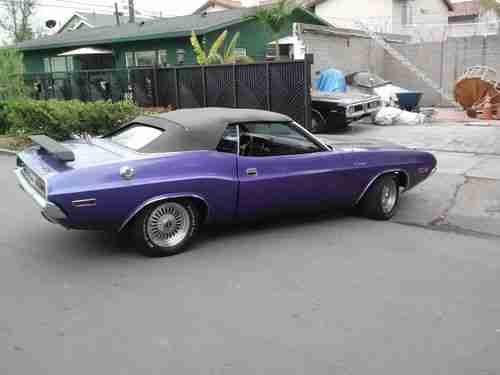 1970 Dodge Challenger Convertible Plum Crazy 440 4 Speed Shaker...G Code...originally 318 auto...now rebuilt 440 1970 code correct block...Six Pack...4 speed...excellent running condition...previous restoration...bottom of quarter panels have some bubbles under paint...some pictures show previous r/t hood and previous auto trans...Fender Tag...professionally built at Rollings Automotive in Fullerton, CA...available to be seen in Fullerton, CA...714-651-0460 David
