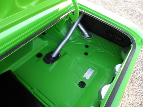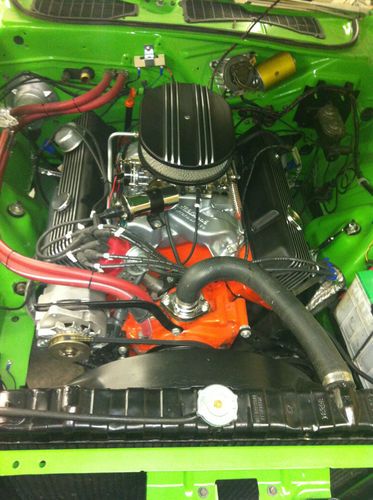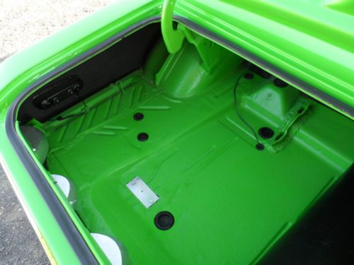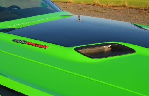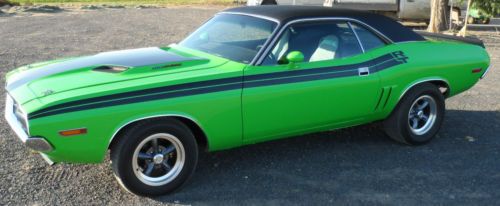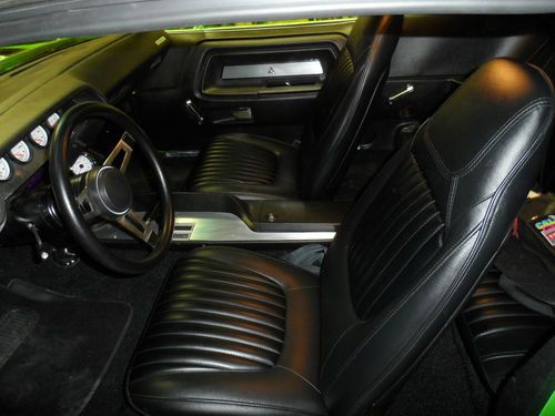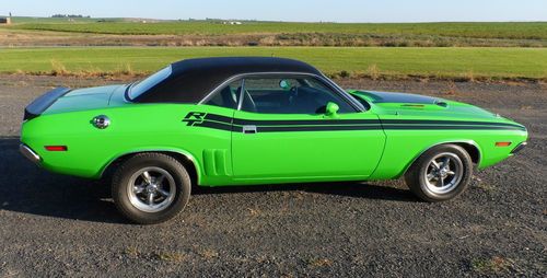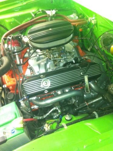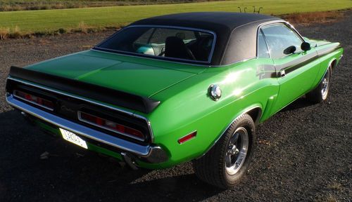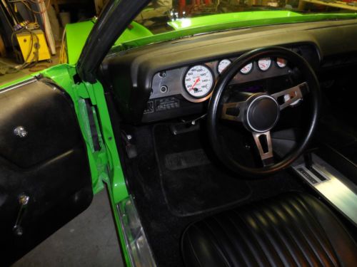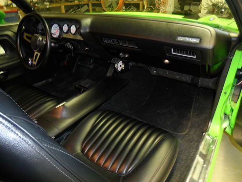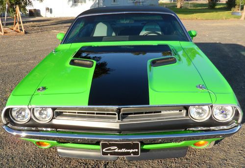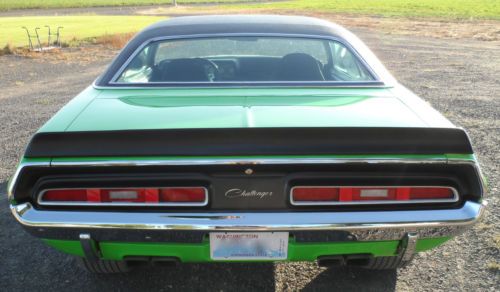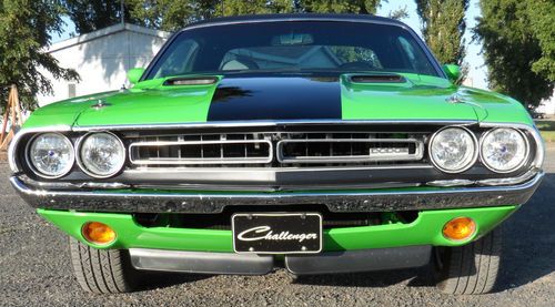 1971 Challenger R/T re-creation. Originally born a B5 Blue 318/904 car. Underwent a complete restoration a year ago and has won numerous shows. every nut bolt and part was meticulously cleaned, blasted, and painted or powder coated if possible, or replaced with new when not. Once stripped to the bare metal very little rust was discovered. The only repair done was small patches in the quarter to top seams other then that the car retains 99% of the sheet metal it was born with which includes, fenders, doors, quarters, roof floor pans, trunk front valance, etc. etc. The only replaced metal was the rear valance with an AMD exhaust cutout one. So now for the details. ENGINE: Early 70's standard bore 400 big block with all new TRW flat top 9:1 pistons,cast rings, Comp Cams R/V cam and lifters, double roller timing set, melling oil pump, Michigan and Clevette rod and main bearings, 1967 383 forged crank and rods 10/10, all professionally balanced, fresh 516 heads, topped with new cal customs valve covers, edelbrock intake and carburetor. new water pump, pulleys, belts, hoses, custom chevy 1 wire alternator setup, uni lite distributor, cal custom air cleaner, lokar kick down cable setup, TRANS: 60's 727 with master rebuild kit, trans go stage 2 shift kit, re manufactured converter, and new tail bearing. REAR DIFF: 8.75 with early 70's non rebuild able o.e.m. 3.23 sure grip, with new green axle bearings and seals all around with brand new Mopar performance Hemi leaf springs. BRAKES: complete front aftermarket o.e.m. style disk setup with all new o.e.m. style rear 10" drum. STEERING: complete poly graphite front end bushing kit, all new PST re build kit containing ball joints, tie rod and sleeves, pitman, and idler arms. New PST 1" pro touring torsion bars with KYB front shocks with Gabriel skyjacker rear air shocks. Napa re-manufactured power steering box. WHEELS AND TIRES: Summit racing (Vision) 15" X 7.5 torq thrust d style wheels with Les schwab grand am 295/50/15 rear and 235/60/15 front tires with 95% tread. EXHAUST: Dougs ceramic coated headers with 2.5 custom built aluminized pipe, flow master 40 series mufflers, and PG classic stainless tips. ELECTRICAL: o.e.m. trunk harness new forward harness and engine harness. custom zoops street rod clear high beam headlights with zoops tri-bar low beam lights on independent relay kits. custom rear l.e.d. tail lights integrated in original restored pods and lenses (keeps original look inside trunk). custom green l.e.d lights in now functional hood scoops. all new door switches, headlight switch, high low switch, etc. etc. INTERIOR: New Year One front and rear covers, Year One headliner, carpet, dash cap, arm rest pads, trunk divider, rear seat shelf, sill plates, grant rim blow steering wheel and horn cap, and visors. all nice original interior plastics and console. custom brushed aluminum and clear coated console plate, dash plate, Year one wide seam headliner, and door panel plates. DASH: all new Autometer Phantom mechanical 5" speedometer, 2 5/8 fuel, electric oil, electric water, and voltage. Kenwood KDC CD stereo with 2 4' dash speakers ans 2 6x9 Sony explode deck speakers. BODY: all original laser straight rust free tin taken down to bare metal, PPG epoxy coated, body worked, then primed with 4 coats PPG 2K sand-able primer then sanded between each coat with first 120, then 180, 220, and final 420 before a sealer coat then 3 coats of PPG DBC custom mix sassy pear green (spin off of sassy grass green with gold and teal pearl in it), then 3 coats of PPG 2021 clear coat, then 1500 wet sanded and buffed. All bumper brackets and misc mounts were blasted and powder coated, bumpers are brand new Year One's. Grill is original un damaged stripped and re argent painted. Hood is not aftermarket, but an o.e.m. one. The stripe is not vinyl but hand layed and painted with a custom r/t in ghost then buried in clear. vinyl side stripes and spoiler are licensed Chrysler. I'm sure I'm missing all kinds of details to mention because so much has been done to it. If you have any questions feel free to ask. buyer is responsible for pick up/shipping unless arrangements are made with me prior to end of auction. sold as-is where is. GOOD LUCK, AND HAPPY BIDDING!