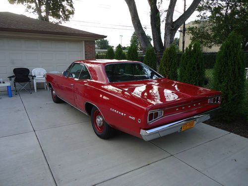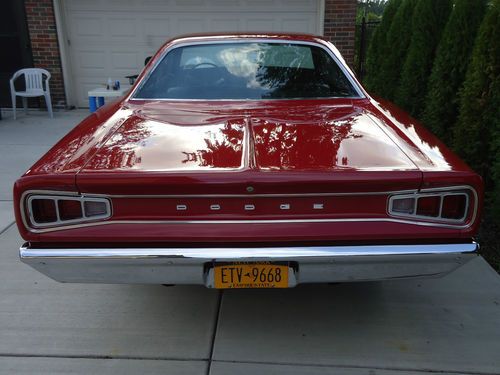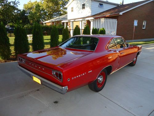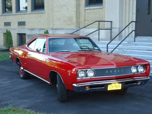 1968 Dodge Coronet H-Code 383 High Performance. 1 of 934 automatics built, number matching drive train with complete documentation including Broadcast Sheet, Owners Manual, Fender Tag and Certicard. The car was sold new at Dobb's Motors in Nampa, Idaho. Car was repainted in 2011 in base clear. At that time 2 very small holes were found on the lower rear quarters, very bottom near drain plug. Lower quarter patch panels were installed so we could check and preserve trunk extensions (they were perfect). Paint is 8.5 out of 10 (me being very critical of any flaws). Front and rear seats re-upholstered (Legendary), carpet excellent, Dash orIginal - no cracks, headliner original - very nice condition, bumpers - re-chromed, all bright work is very nice. New Goodyear tires (5) would drive car anywhere. Just passed NY State Inspection. Everything works as it should - runs perfect.