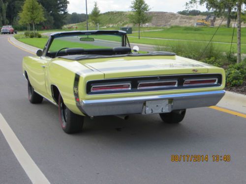 You are bidding on a 1969 Dodge Coronet R/T Yellow Convertible that is being sold in AS IS mint condition. 100 % Restore . Matching number car !1 out 5 cars The car has a 440 cid 4 barrel V8 (High Performance) 375hp,18 Spine 4 Speed Manual Transmission, Track Pak with DANA 3.54 ratio , special handing, 26in Radiator, Black Bucket Seats Vinyl Seats, Console w/Woodgrain Panel, Console, Rallye Instrument Cluster Package , AM Radio with 8 Track (10 Watts) ,Tachometer, 3 speed wipes . Tranverse Stripes, Black This was build 12-19-68 . Odometer say 3 Mileage are Exempt