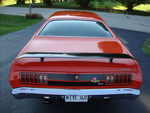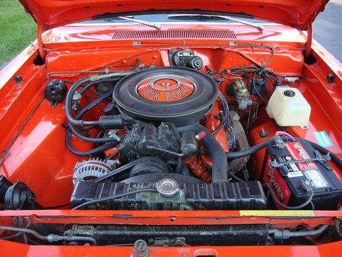* ENGINE: CODE E55, 340 4 BARREL, V8 275 HORSEPOWER. THE ORIGINAL ENGINE PUT IN BY THE FACTORY WHEN CAR WAS BEING BUILT, THEREFORE IT IS NUMBERS MATCHED ORIGINAL. ALL INTERNALS AND EXTERNALS FROM CARB TO PAN ARE ORIGINAL UNMOLESTED FACTORY MOPAR, EVEN THE ORIGINAL CARTER THERMOQUAD CARBURETOR. JUST COMPLETELY TUNED UP, INCLUDING, PLUGS, WIRES, FILTERS, AND A NEW CHOKE PULL OFF. NEW ALTERNATOR AND BATTERY.