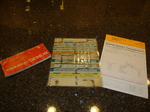 * TRANSMISSION: CODE D32, HEAVY DUTY FLOOR SHIFTED AUTOMATIC. 727 TORQUEFLITE, IT TOO IS THE ORIGINAL TRANSMISSION THE FACTORY PUT IN IT WHEN THE CAR WAS BUILT. ON 5/3/12 - A COMPLETE, PROFESSIONALLY DONE, OVERHAUL WAS PERFORMED. NEW STEEL PLATES, FRONT & REAR BANDS, BUSHINGS, PUMP, REAR DRUM, DIR DRUM, GOV SUPPORT, AND NEW CONVERTER. 818 MILES ON IT SINCE OVERHAUL, HAVE RECIEPTS!
