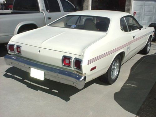 This is an original, unmolested 1976 Dodge Dart Sport, Spirit of 76 model. It has only 69,000 original miles. It is not perfect by any means, but cleans up and shows very nice. It has the 225 slant six motor with the A633 four speed transmission. The rear end is a 8 1/4. As for production numbers, I have found anywhere from 200 to 1000 ever produced. The door panels and the rear window panel have never been modified for speakers, and the radio is totally original. The original four speed shifter is made by Hurst. This is a very rare car, have you ever seen one before? The tires and wheels are aftermarket. They are made by Vision, Legend series, and cost over $1000 for the wheels alone. It has new brake pads on the front, and new shoes on the rear. The wheel bearings have been repacked as well. I have gotten 24 miles per gallon while commuting with this car. It has started every time when my other cars wouldn't start. It has an engine heater. It really needs to be restored, but I haven't the time or money to do so. The interior is decent, but the drivers seat is torn. The original carpet is in great shape. The door seals are nice and soft, and do not leak when washing the car. I will post more pictures soon. I removed the door sill plates to look at the floor pan and there is very minimal surface rust. No rust that will be a problem whatsover! I love this car, but have to sell because of financial troubles. If you have any questions, please ask before bidding.