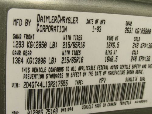 2003 Grand Caravan Sport AWD, original owner, non-smokers, always garaged, scheduled maintenance, looks and drives great, very clean interior. This is the last year Dodge made the Grand Caravan with the All Wheel Drive option. The second and third rows of seats come completely out of the vehicle and reveals a huge cargo area. It will hold a full size 4' x 8' sheet of plywood. Seats - cloth low-back bucket, rear seats are bucket and rear split bench. standard equipment includes air bags (front, next gen, multistage), 4 wheel disc anti lock brakes; power rack and pinion steering; illuminated entry; keyless entry system with 2 transmitters; child seat anchor system; headlamp off time delay; rear window defroster; heating element in exterior mirrors; load leveling and height control; sport touring group; air conditioning w/3 zone temp control; air condition rear w/heater; windows - power, driver one-touch, power quarter vents; power locks; radio - AM/FM, cassette with changer control, CD player; power outlets front & rear, 12V DC; power outlet auxiliary 12V; instrument cluster; sunscreen glass; power heated fold away mirrors; fog lamps; 16 x 6.5 aluminum wheels; six speakers; tilt steering column; easy out rear roller seats; console, overhead with trip computer; storage drawer under seat; cargo net, front; grocery bag hooks, rear, floor mats front and rear; sun visors with illuminated vanity mirrors; power 8-way drivers seat; power right sliding door; power liftgate; roof rack; power adjustable pedals. Trailer tow prep group - full size spare tire, heavy duty radiator; engine oil cooler; wiring harness - trailer tow. Four Michelin HydroEdge tires with 16000 miles...the tires are rated for 90,000 miles. New interstate battery. In 2010 the van was involved in a collision with a deer, the airbags DID NOT deploy. Damage was to hood, bumper and fender. There is a small indentation on the front edge of the hood. Also scratches in the paint on the drivers side sliding door, rear bumper. Terms of sale: $500 deposit via PayPal with winning offer/bid. Balance due via Certified Check or cash within seven days of winning offer/bid. If balance due is not paid within seven days or other arrangements are made, buyer forfeits the $500 deposit. Title will be transferred upon payment in full via cash or after check has cleared. Buyer is responsible for all shipping or transportation costs as well as the arrangements.