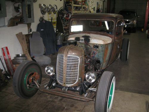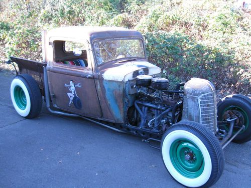 Sweet running driving truck 33 cab farm trailer cut down for the bed the Grille is from a Oliver tractor custom frame 49 dodge flathead motor 3 speed with electric overdrive 8 3/4 mopar rear Speedway front with big GM disc has a dual resevoir mopar master cyl with a adjustable porportioning valve. The motor has hand built dual 49 carb intake with original oilbath air cleaners. The exhaust is custom built 3 into 1 equal length Headers with dual stacks.Wheels are powder coated the tank is a 15 1/2 gallon Keg. Radiator is a 4 row from a Toyota Hyster.Still 6 volt positive ground all lights and horn work I have driven it as far as 150 miles in 1 trip very reliable. Seat belts are from a Helicopter.Has a Mopar delux Heater.Asking $8500 not looking for trades or low ballers dont need a fire sale just want to do something different. Call me at 503-589-0763 before 8pm pst. Thank you.