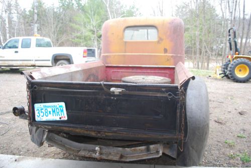 1946 Dodge Pick-up Truck. It is considered a pre-war body style though. The body has some rust, but is fairly reasonable for a 68 year old truck. The fenders are solid but look like they may have had dents hammered out of them, as they have many dimples in them. The windshield is cracked, and the windshield frame is rotted pretty well, but the crank out mechanism still works. The wood in the bed is rotten. The tailgate needs to be held on with a ratchet strap, as the bed sides tend to droop outwards. The rear window is fine, and both side windows are fine and crank up and down. The door latches work well. The interior is as plain as you could imagine. It has a bench seat, with naugahyde that is torn/cracking. It has wood panels over the battery box and around the shifter, and both are rotting. I'm not sure if any of the gauges work, but about 5 years ago I charged the battery and the headlights and gauge lights worked. The engine is the stock 6 cylinder flathead. 5 years ago I had it running, and drove it down the road. The clutch didn't slip, the tranny worked in all 3 forward and 1 reverse gear. The hydraulic brakes do not work, and I had to use the parking brake to slow down. The accelerator pump in the carb was shot, so it took some feathering of the throttle to move it. I haven't attempted to revive it since that day, so the current running condition I am stating as not running. When I had it running, the generator was charging fine. This vehicle is being sold AS-IS, and it's old so expect there to be things wrong with it. This truck is also for sale locally, so this auction may be canceled at any time. No delivery of this truck is included, as the buyer is responsible for pick-up/transport. A $500 deposit will be required, and the remainder of the balance will be due before the truck leaves the premises. Additional photos are at http://s1243.photobucket.com/user/brwisted/library/1946%20Dodge |