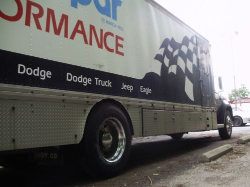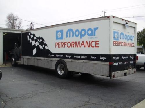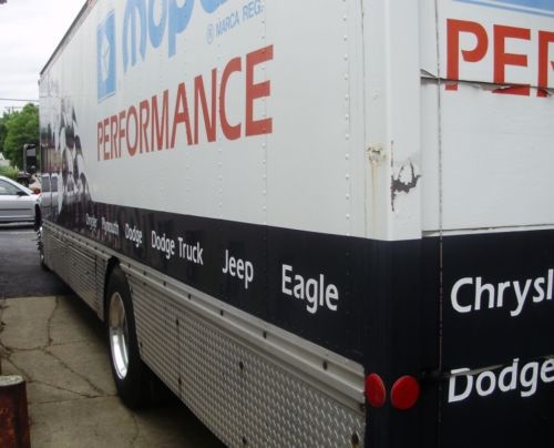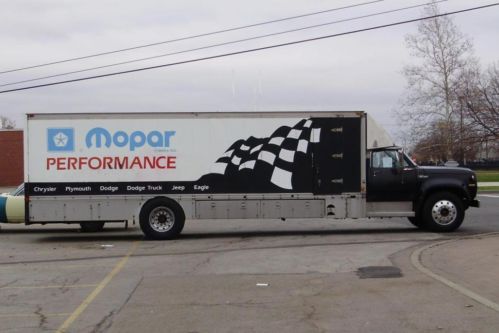 The body plate says “Kirk Racing Cars” (Gil Kirk’s Rod Shop). 181” wheelbase, 28 foot box, dual 50 gallon fuel tanks, hardwood floors in excellent condition, sleeper, 38 foot total length. 10 foot height. Originally painted all white with red Rod Shop stripes, later the cab was painted red, Arrow Racing painted the truck black and added the Mopar Performance livery in 1987. Box sides and integral slide-out ramps are aluminum. Rear roll-up door is wood, but is starting to rot and should be replaced. Original, numbers matching 413 2-bbl, 5-speed manual, 2-speed rear, 25,000# max GVW, air brakes. Professionally maintained by Chrysler racers, engineers and mechanics its entire life! Some rust in bottom of doors, rockers and inner fenders. Cab and floors are solid. The cabs on these trucks are IDENTICAL to all 1972-80 Dodge standard-cab pickups. That means that doors, glass, rubber, etc. is all available aftermarket. Lamps and lenses were manufactured by the aftermarket originally and are still available. Interior trim is identical to 1972-76 pickups. The truck currently has Dodge Daytona cloth buckets. Originally the cabs were bare steel, except for carpet and door panels. Aluminum diamond plate running boards and lower box sides (will shine like chrome if you have the patience). Fiberglass roof fairing. New 4412 Holley carb, new Carter electric fuel pump, fresh tune-up, good brakes. 22.5” Alcoa aluminum wheels with one additional spare. Includes owners manual, service manual and original sales brochure. Runs and drives. Truck has been off the road for ten years and requires minor maintenance. Truck was last driven on a twenty mile excursion in November 2013. To travel any distance it should be transported on a flatbed to your location unless you have strong mechanical abilities. Yes, I have offered this truck for sale previously, at a higher price, but I now realize that I do not have the resources to do this truck justice. 614-580-9428 |