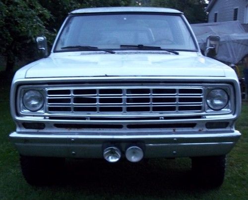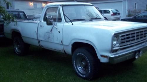 For sale is a 1977 Dodge W200. This is a full time four wheel drive Army surplus truck. It has a 318ci motor with a two barrel carburetor. The only power option on the truck is power brakes. The steering is not power assisted and is only challenging in tight parking garages. Some rust - as can be seen in the pictures. I have owned it since '98. Previous owner said he bought it from Purdue Univ where it was a utility vehicle. Engine and drive train run good. Does not have a muffler or tail pipe. Also needs wire harness work, tail lights do not work and 1/2 the time I have to pull the coil wire to shut it down. Has an after market 100 gal gas tank in bed that is above 3/4 full. I replaced the bumper, grill, tailgate, and seat from a '76 Dodge. Bed is solid. This is probably not a candidate for a daily driver, but it is the perfect go anywhere utility truck.