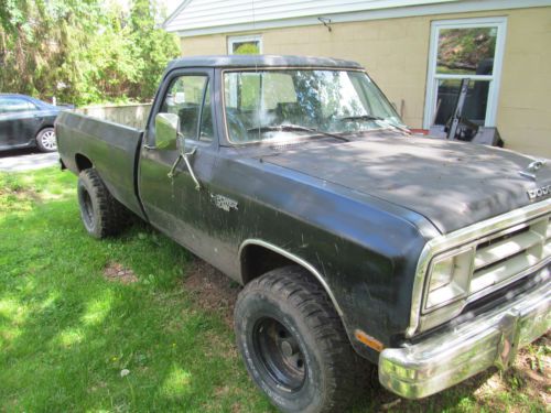 Up for sale is a 1986 Dodge Ram. 318 Automatic 4 Wheel Drive. Nice solid 35 inch mud terrain tires. Clear title in hand. This truck will make a great work truck, or off road fun. The odometer reads 76,000, I was told this was original as it was a farm truck, but I can not validate that, title shows exempt. Truck has headers, no cats, and flowmasters. IT IS VERY LOUD!! This is clearly no show piece I bought it for yard work and it is a tough solid dependable truck. I just recently put $1500 in the cooling system, new intake gaskets, new hoses, new radiator, and some other stuff. It is not inspected but I had an inspection done on it about 6 months ago...besides the exhaust it should pass. It would need cats to pass, right now it is welded straight pipe so I just drive it as is. I would guess brakes are in the future at some point, with the big tires they feel a little soft.