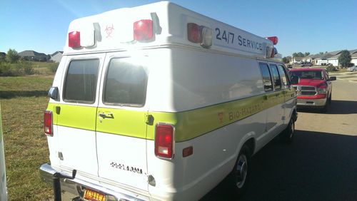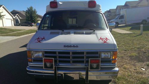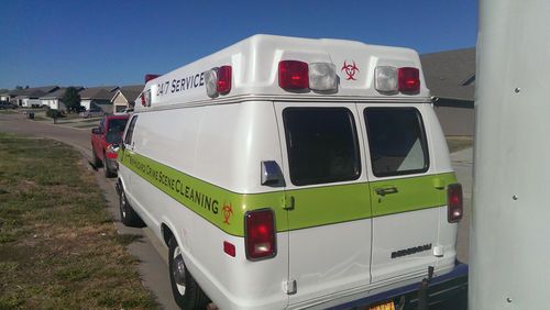 We are selling the mascot of our crime/trauma scene cleaning division. Up for sale is a good condition 1989 Dodge 3500 Van/Ambulance with 27,000 original miles. It has a 5.9 L V8 engine that DOES leak a little oil around the valve cover gaskets. There is a small rumble when stopping from interstate speeds, but around town it is smooth. There is a broken piece of shelving inside back passenger side door. Other than the listed item it is a full fledged lime green and white ambulance This vehicle was NOT used in the cleaning of any bio-hazardous material, just as rolling advertisement. All of the emergency lights/ scene lights work like a champ. It also has 2 rows of light in the back(SEE PICTURES). Very good condition and we have a clean and clear Kansas title. Would make a great PARTY BUS/PARADE AD VEHICLE!! Full amount due within 7 days with a $500 deposit within three days. Delivery is possible for an extra charge, however pick-up is free. Thanks for looking!!!