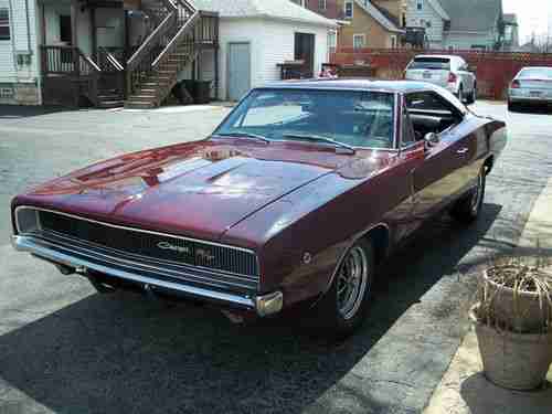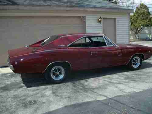 1968 Charger R/T, 426 Hemi - This is a very rare car, possibly one-of-a-kind. I purchased this car in early 1997 with 27,000 miles on the odometer - the odometer now reads just a little over 41,000. Car was built September 6, 1967, in Hamtramck, MI. Since VIN numbers were not stamped on blocks prior to '68, there is no VIN number on this block - it is, however, date code correct and all paperwork indicates it is the original block (see picture). Color is burgandy metallic (RR1) with a black interior - one of 211 Hemi 4 speeds.
