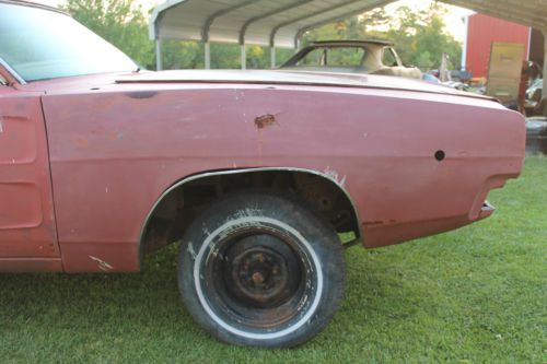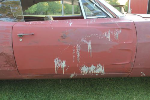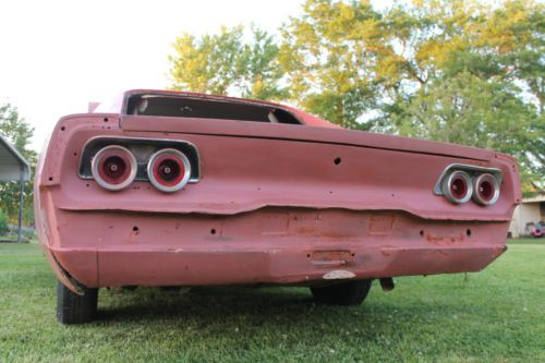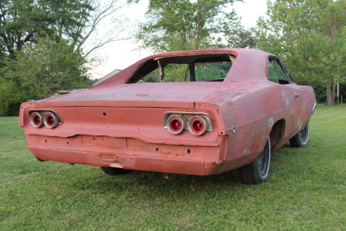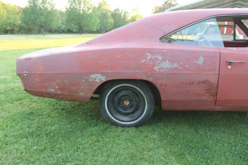 The car is solid, for the most part, with typical Charger/B-body rust in the rear. The frame rails are solid with typical wear and tear from floor jacks, curbs, etc., but I could not see any rust issues on the rails. At some point in the car's past it was wrecked on the driver side. The exterior sheet metal was replaced but you can still see signs of damage in the left front wheel well and the left rear outer wheelhouse. Besides the left fender and quarter, the door was replaced too and it opens and shuts just fine. The car was repaired like most body shops did back in the day; they did an exterior cosmetic repair and didn't bother with the rest. The car has a nice woodgrain steering wheel and I did not notice any cracks. The interior was dyed/painted red. The carpet material was glued to the floors so I am not able to peel it back without ripping it to pieces. The floors (interior & trunk) were patched at some point and they hold up fine, but should be replaced if you plan to build the car to "show quality" standards. All in all, they car would be a great start for someone who has been looking for a Charger, but do not want to spend $10k for a project. I originally purchased the car with the intensions of doing a cheap low-buck Charger build. Kind of like the guys did on the show "Roadkill" (Youtube it... it's quite interesting). I have too many other Mopar projects and decided to sell it so that maybe someone else can enjoy it. The car shows 60,568 miles. I am not sure if that is the original mileage or is it has rolled over. The car has been off the road for many years, so it could possibly be accurate. The car does not have and engine or transmission. A few other missing parts that I can think of are the passenger bucket seat, grille assembly, rear seat, rear glass, driver side quarter glass, front and rear bumpers, radio, and misc trim. What you see in the pictures, is what will go with the car. I do not have a title for the car but I do have two Bill of Sales from the previous owners. After the sell, I will assist in getting a title for the car if you are interested. Here in MS, I can apply for a title with at least two BOS. The car DOES have it's original fender tag and it decodes as followed: For MANY additional pictures of this car, I have have set up a photo album at: http://s6.photobucket.com/user/CornDog05/library/1968%20Dodge%20Charger%20RED