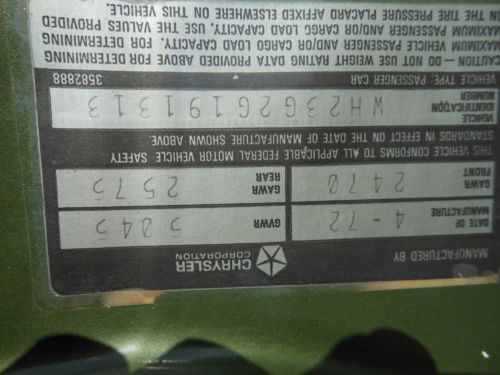 YOU ARE BIDDDING ON A 1972 DODGE CHARGER TOPPER SPECIAL. Only 1 OF THE 41 WH23G2'S BUILT AT THE ST. LOUIS PLANT. ALL TOPPERS WERE 318 V8 WITH TORQUEFLIGHT TRANSMISSION. THE VEHICLE IS EQUIPPED WITH AIR CONDITIONING, POWER DISC BRAKES, POWER STEERING, RADIO WITH REAR SPEAKER, HIDDEN HEADLIGHTS, REAR DEFROSTER, R/T PACKAGE "150 MPH SPEEDOMETER" AND FENDER TURN SIGNAL INDICATORS. IT IS ALL MATCHING NUMBERS CAR. WH23: G2G: 318 150HP(net) or 155HP(net) 1-2BBL 8 CYL 191313: Sequence number E44: 318 cid 2 barrel V8 230hp V4W: Unknown Top Color H51: Air Conditioning with Heater M25: Wide sill moldings V7F: Accent Stripes, Green The car is very solid, originally from Texas. It is a RUST FREE CAR and is mostly original. From what I can tell the car has only been painted one time, seats has probably been recovered at some point in time. It has the Magnum 500 wheels. Every thing is complete except for rear valance and headliner. It runs and drives great, all the gaps are perfect and the doors shut like a new car. It would make a great one to restore. Was hit in the rear at some point in time, not bad as you can tell in the pictures, however the insurance paid for the car making it a reconstructed title. Title shows 14,425 miles as well as the instrument cluster. Not sure how accurate it is... But it wouldn't Shock me if the mileage was true. It is so solid, and drives with no rattles, etc...From what I was told, car hasn't been driven and has been stored for the last 7 years.. . Great Barn Find. Must Sell No reserve... Bid to win..... Car is available for inspection. On Apr-20-14 at 20:22:45 PDT, seller added the following information: this car is not an RT Charger... It is a charger topper which came originally with a vinyl top. top isn't on the car but you can see where it was supposed to go...... it is also missing one piece of chrome for the vinyl top that I forgot to list...The information with 1 of 41 is in GALEN GOVIER'S REGISTRY with the current options... This one is not registered with Galen Govier's Registry... car is in need of tires... any other questions feel free to send me a message. Hopefully this answers most of them... |