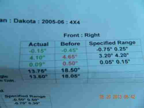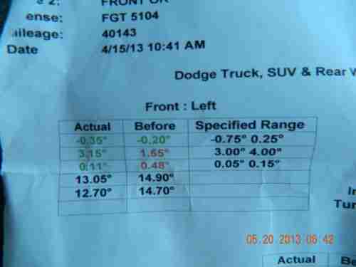 I HAD THE TRUCK ALLIGNED AND IT TURNED OUT GOOD, I HAVE PICTURES THAT SHOW THAT EVERYTHING IS IN THE GREEN.