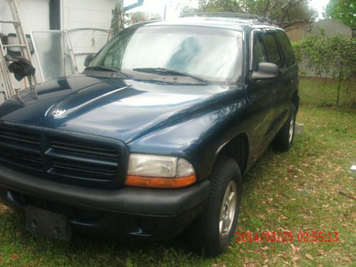 THIS BLUE 2001 DODGE DURGANGO 4X4 SPORT IS FULLY LOADDED, HAS SPARE TIRE,FACTORY 6 LUG, NEW TIRES, STILL LOOK NEW, AFTER MARKET DVD, CD PLAYER , NO TEARS OR HOLES IN SEATS DOES HAVE SOME STAINS, 3RD ROW SEATING, FRONT WINDOWS DO NOT STAY UP THE MOTORS DO WORK ELECTRIC WINDOWS AND DOORS, TOWING PACKAGE, MILESAGE IS 146000. ENGINE HAS A KNOCK IN IT. DRIVEN DAILY. FREE TITLE AND CLEAR, LOCAL PICK UP ONLY, SERSIOUS INQURYS ONLY,CASH UPON PICK UP. PLEASE DON'T BIB IF YOU CAN'T PAY NOW. AGAIN CASH ONLY.PLEASE READ ALL INFO BEFORE ASKING QUESTIONS. THIS IS AS IS WERE IS.