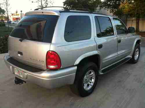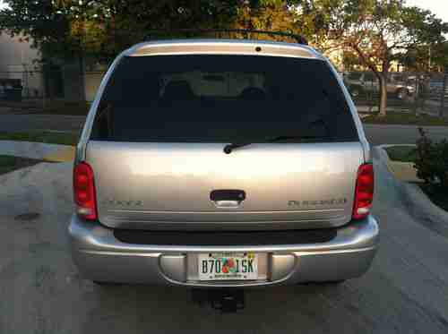For sale is an excellent condition, One Owner, 2002 Dodge Durango SLT 4 Wheel Drive with the 4.7L V8 with automatic transmission. She has only 137,291 original miles on this Florida Car. (Only 12k miles a year.) Has a Car Fax / Autocheck showing 1 owner. Been in Florida it's entire life. This car also qualifies for both the Autocheck and Carfax Buyback Protection Guarantees. See all the loaded options above. Factory Heavy Duty Towing package installed. Comes with original key and keyless entry remote. Original manuals. Removable 3rd row seat. Seats 7-8 people. Has a TV system, but it has not been tested. Power windows, Power Mirrors, Power Seats and Power door locks. Runs and drives great and everything works perfect. This car needs nothing. All fluids are in excellent condition and just serviced. Tires are BRAND NEW (Less than 2 miles on them), brakes, and battery recently replaced. Brakes are solid. Optional Premium Aluminum Wheels. Ice Cold A/C. Very Clean inside and out. Paint is in amazing condition with only minor blemishes. See pictures. Interior is in excellent condition, only very minor wear, no rips or stains on the interior leather and carpet in great condition (see pictures). Non Smoker owned and no pets. Slight scuffs on a few of the wheels. It looks to have been garaged its entire life and very well maintained. It was traded in at a South Florida Dodge Dealership for another New Durango. Please see our 100% feedback! This is a really nice 02 Durango and is going to make someone very happy. Our goal is to make sure you are 100% happy with your new car.