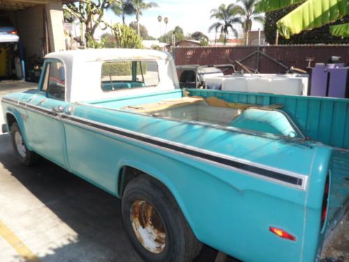 has 318 poly v-8 2 barrel carburaetor,and manual 4 speed transmission,will do 80mph up hills. California truck whole life NO RUST 99% rust free,surface rust only on hood wheels selling as-is nice straight original paint clean solid truck,wonderful rare original shape! Complete unmolested ,had a camper shell on it since new. So truck was sitting and I am in process of fixing it up.Every day is getting better condition... So bed is really nice and dent free,no bondo no accidents The truck is LASER straight,original turqouise paint is good Patina look can be buffed out. Has surface rust on hood and misc.Frame is solid 100% no rust surface only,lives in Garden grove southern California whole life rebuilt motor {10] years ago runs drives no knocks no smoke dual tanks,new starter switch,new clutch resovoir and divertor,new master brake cylinder. Truck is restorers dream from california,complete truck one owner The truck has alot of character and patina,the tires hold air and roll,but may need replacing,as well as brake cylinders may need adjustment. current California title licensed insured my name Truck was special ordered on d100 frame with 3/4 ton axles and camper special cab ,to save on purchase price as ordered new. Truck is missing back window and tailgate I live close to Los angeles ,will help with shipping,assist to put on your trailer Great truck for South,East coast.Wouldn't be surprised if someone wants truck in Europe or Australia,this is a great straight bondo free truck Buy with confidence this is priced low for sale .I reserve right to sell locally. I am Bryan I have a Mobile Auto Detailing buisness,this is my truck in my name No scams ,no fake emails ,don't buy it now unless you are real. Call for appointment or buy Thank you for looking feel free to make real offer.. 714 356 8573 |