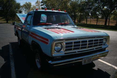 1976 Dodge D100 Spirit of America. "GO PATROTIC" Conversion by Dodge, yes this is the real deal only 200 produced -Tunnel cover, Seats, Dash and door panels have been changed. Engine new 360 with 800 miles, Automatic, Power Steering, Power Brakes, AC, Paint Very good, Interior good, No rust. All instruments and AC work. Runs and Drives great!
