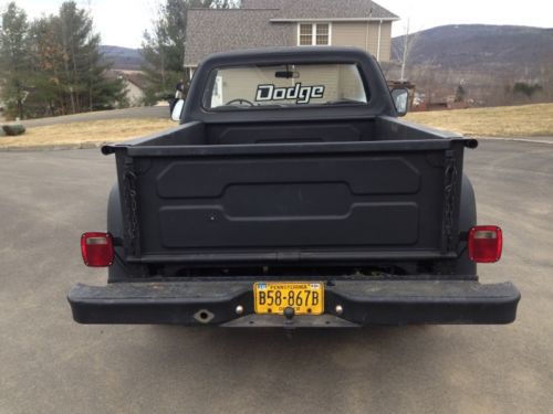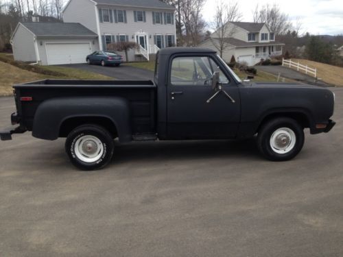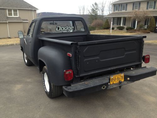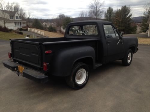 FOR SALE: 1977 Dodge 1/2 ton 2 wheel drive pickup with a 318 engine. Edelbrock 4 barrel with headers with glass pack mufflers. 727 torque-flite transmission with high stall converter and a shift kit. 3:23 posi rear axle.Electric fuel pump and fuel cell mounted under the box. This truck came to me 2 months ago in pieces, with a clear PA title. I now have a NY title in my name. I was told the truck came from the state of Missouri. It is in great shape for a truck 37 years old. The fenders are rust free,but the cab has a few rust holes in it. It has a repair panel under the drivers seat and it comes with a new rocker panel for the passenger side. It also comes with a spare dash frame,spare grille, and new steps for the side steps on the box. This is a fun truck to drive. This is not a show truck. The flat black paint is far from perfect, but if your looking for a truck to bop around in this summer,than this is perfect. Put a sound system and speakers in it a have some fun. Front brakes are like new, the rear axle was just serviced,and the heater even works. I can help with delivery to the surrounding 100 miles or so. Please email me with any questions. This is being offered for sale locally as-well.Thanks for looking and check out my other vintage Mopar items for sale.